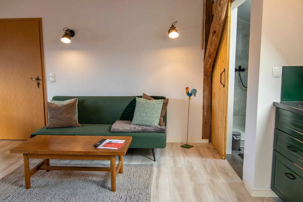 In der 51 m² grossen, rustikal modern eingerichteten Wohnung befinden sich zwei Schlafzimmer, ein Duschbad mit WC und eine helle geräumige Wohnküche mit grossem Esstisch. Für Babys steht ein Hochstuhl und ein Reisebett bereit. Ein Schlafzimmer ist mit einem Doppelbett (180x200), Kleiderschrank und zwei Nachttischen ausgestattet, das andere Schlafzimmer mit zwei Einzelbetten (90x 200), einem grossen Kleiderschrank, einem Garderobenständer, einer Kommode und verschiedenen Spielen für die ganze Familie. Eine Klappcouch im Wohnbereich kann als 5. Schlafgelegenheit genutzt werden.