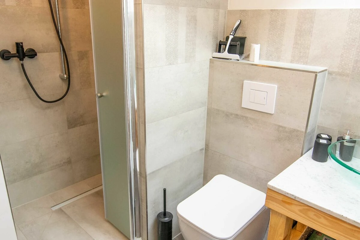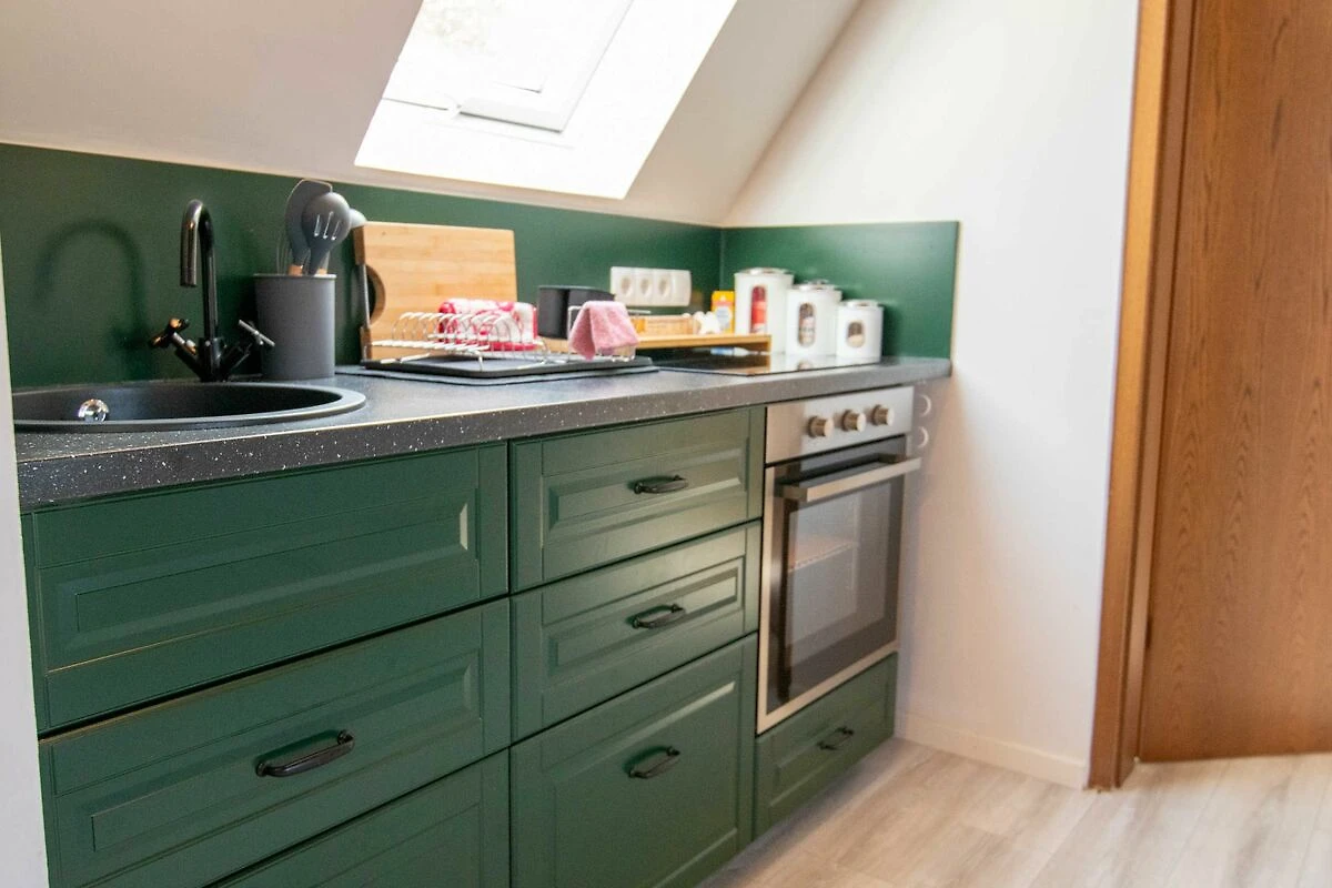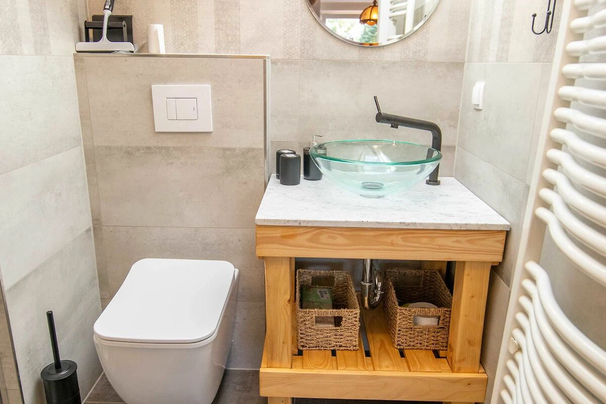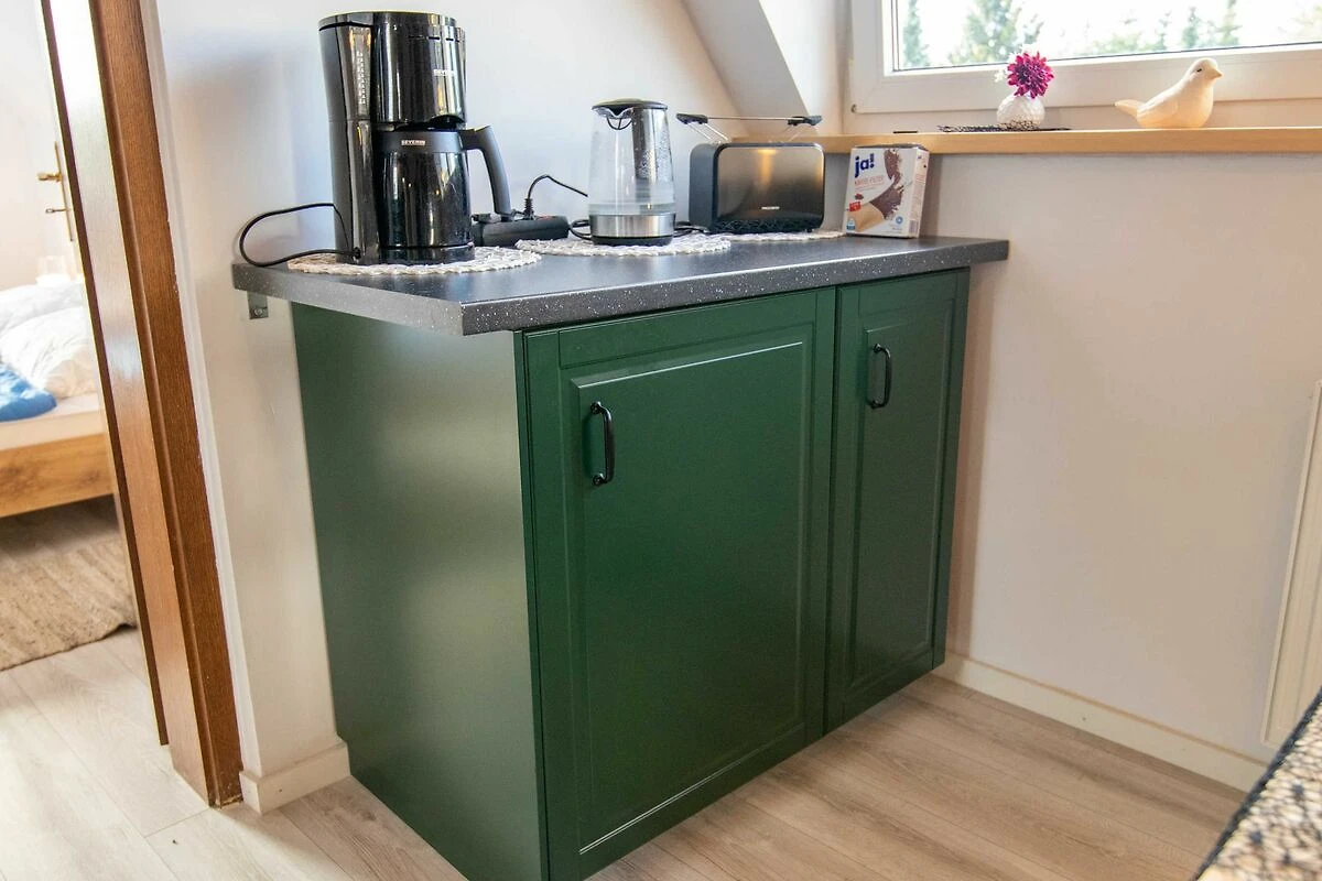 Der Küchenbereich ist zweigeteilt. Im Essbereich befinden sich der Kühlschrank mit Gefrierfach, Wasserkocher, Toaster und Kaffeemaschine. Der Rest der Küche ist komplett ausgestattet mit einem modernen Induktionsherd, einer Spüle, Geschirr, Besteck, Gläser und Kochtöpfen.