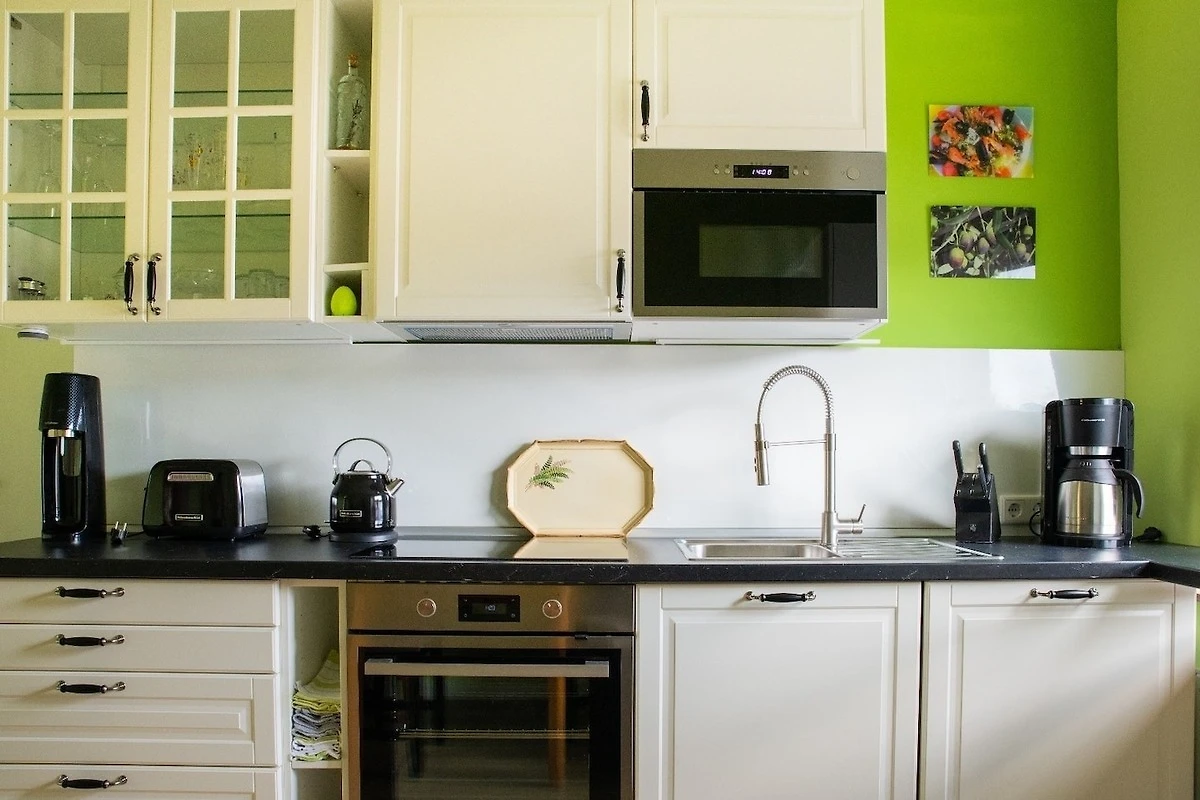 Kaffeemaschine, Toaster, Wasserkocher, Mikrowelle, Umluftofen, Herd, Kühlschrank mit kleinem Gefrierfach, Geschirrspüler