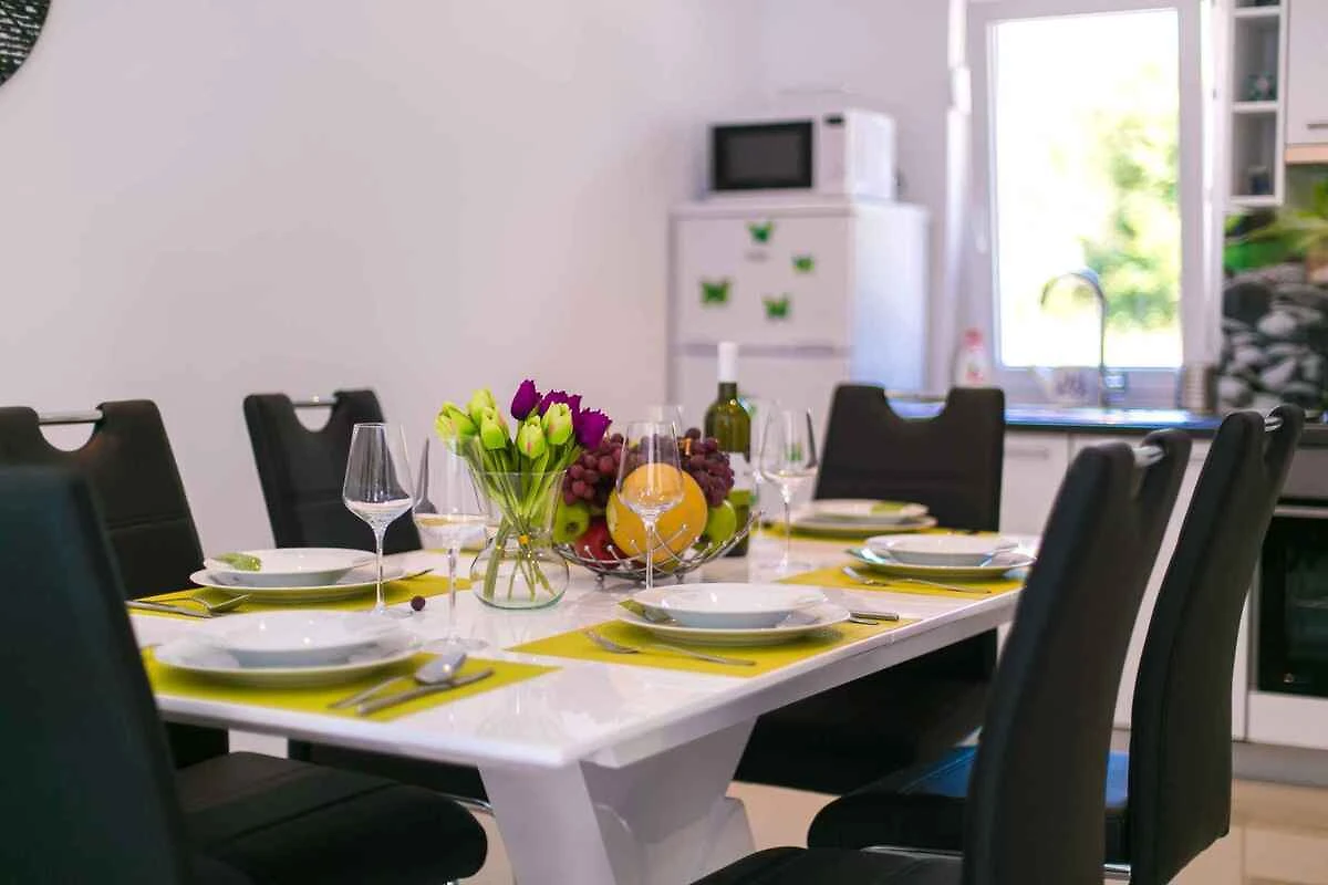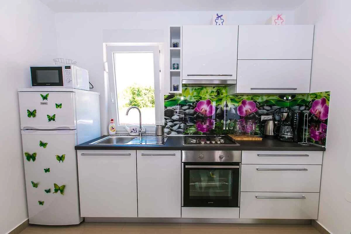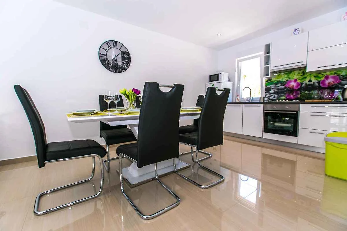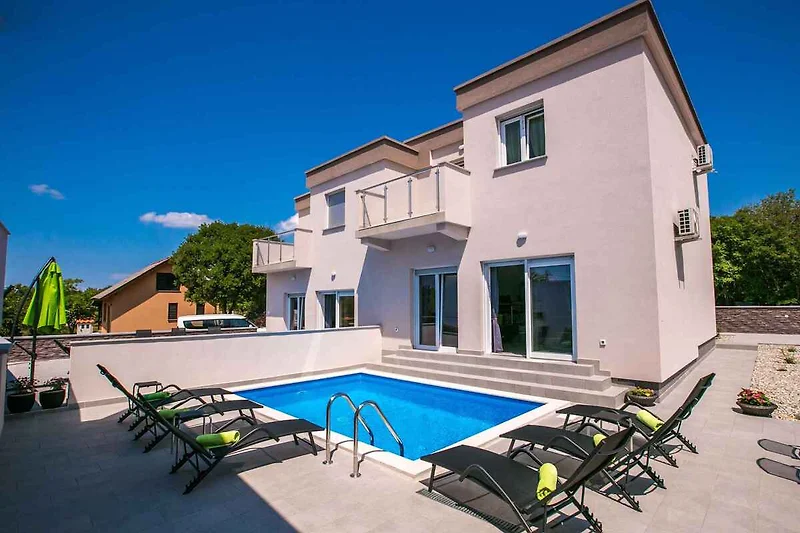 Krk, Ortsteil Krk. Das Ferienhaus befindet sich auf einem 500 qm grossen, geschlossenen Grundstück, von einem Zaun begrenzt. Der Vermieter wohnt nicht im Haus oder auf dem Grundstück. Die Zufahrt erfolgt über eine Nebenstrasse (asphaltiert). Parkplatz auf dem Grundstück.