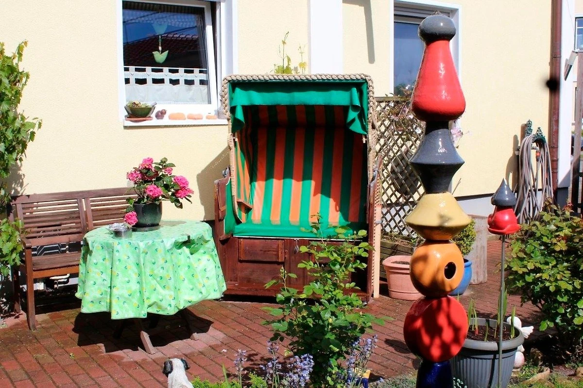 Eine Terrasse, ausgestattet mit Strandkorb, Stühlen und Tischen steht zur jederzeitigen Nutzung ebenso bereit wie bei Bedarf auch ein Grill, um in gemütlicher Atmosphäre den Urlaubstag ausklingen zu lassen. Der Garten ist komplett eingezäunt, so dass auch vierbeinige Gäste sich frei bewegen können.