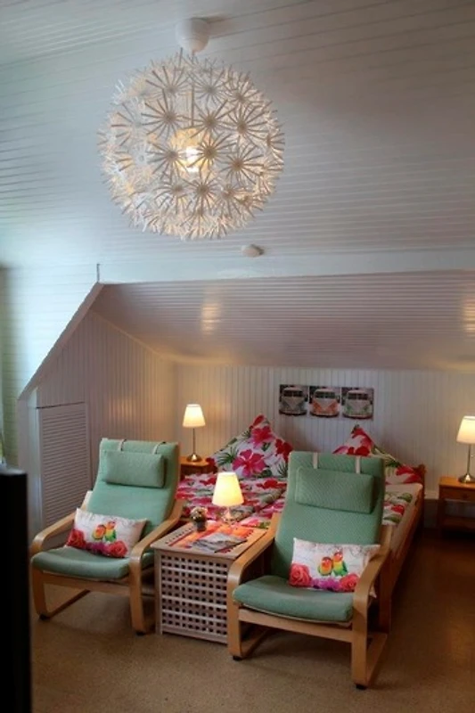 Die Wohnung wurde neu renoviert und ist gemütlich und farbenfroh eingerichtet. Sie besteht aus einem kombinierten Wohn- und Schlafraum, einer separaten Küche mit gemütlichem Sitzbereich und einem Badezimmer mit Dusche.