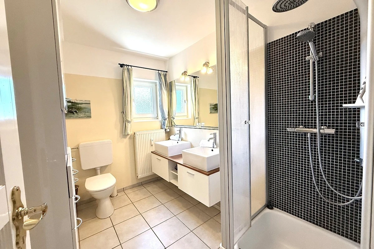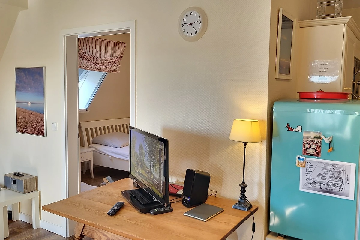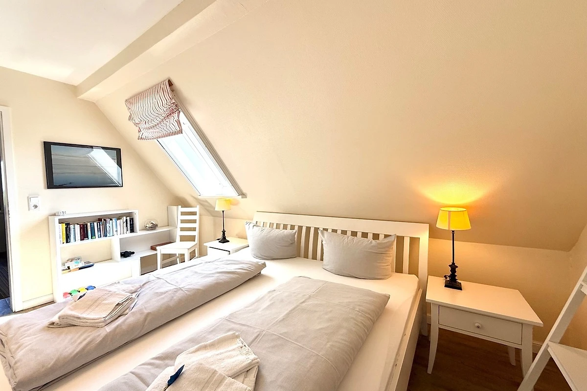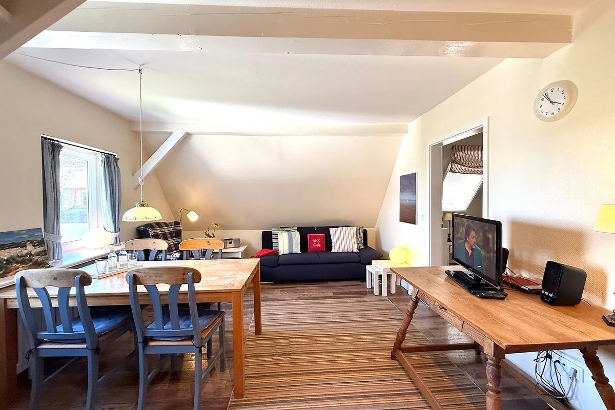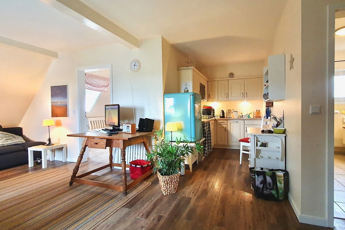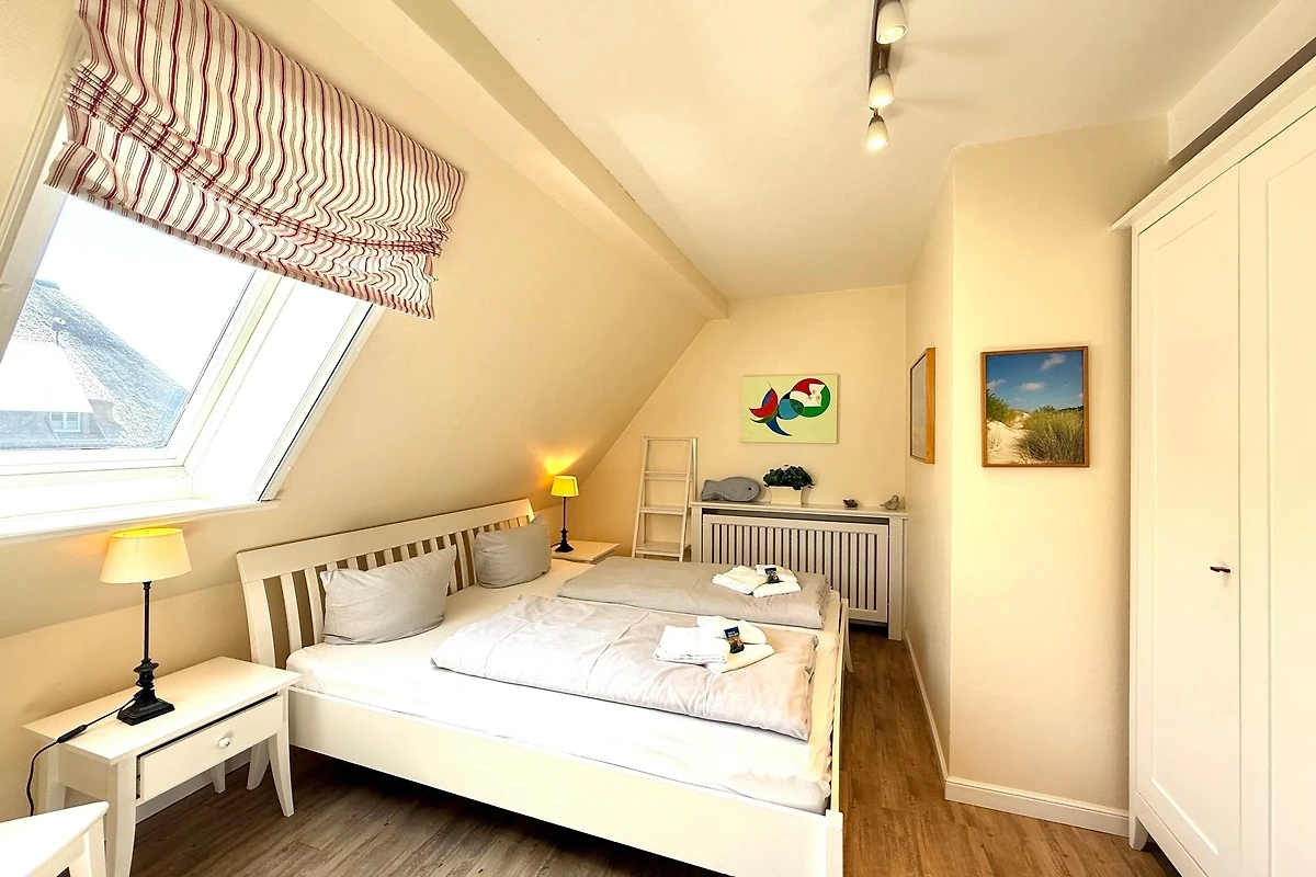 Die Wohnung 27 im 1.OG befindet sich auf dem Deichhof in Dunsum. Es handelt sich um eine sehr gemütliche Ferienwohnung für max. 3 Personen. Das Badezimmer, mit Doppelwaschtisch, Dusche und Toilette sorgt für genügend Bewegungsfreiheit. Ein Doppelschlafzimmer mit grossem Bett und genügend Schrankraum, sowie im Wohnzimmer ein Schlafsofa lassen keine Wünsche offen. Geniessen Sie die Ruhe und Natur auf dem Deichhof. Zu dieser Wohnung gehört ein PKW Stellplatz am Haus. In wenigen Fussmetern erreichen Sie den gemeinschaftlichen Hauswirtschaftsraum mit Waschmaschinen und Trocknern. Im rückwärtigen Bereich des Deichhofs steht Ihnen eine Picknickwiese mit Grillplatz und Sitzbänken zur Verfügung. Gleich daneben können sich Ihre Kinder auf dem grossen Spiel- und Fussballplatz austoben. Vom Objekt aus haben Sie einen perfekten Ausgangspunkt für lange Spaziergänge am Strand und zur Wattwanderung nach Amrum, Fahrradtouren zu den Nachbarorten und in die Marsch und zu dem wohl schönsten Sonnenuntergang der Nordseeregion. Der Deichhof ist in der Gemeinde Dunsum angesiedelt, die im Westen der Insel Föhr liegt. Er liegt an der verkehrsberuhigte Ortsdurchfahrtstrasse und an weitläufigen Wiesenflächen, die direkt an den 500 m entfernt liegenden Deich der Nordsee reichen, mitten in die Natur eingebettet. Der Deichhof kann somit als Oase der Ruhe und Natürlichkeit betrachtet werden.