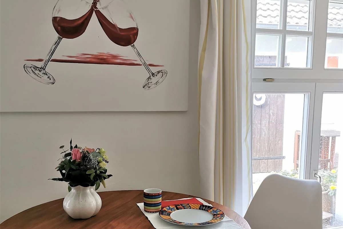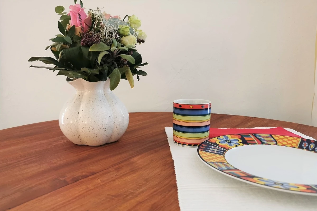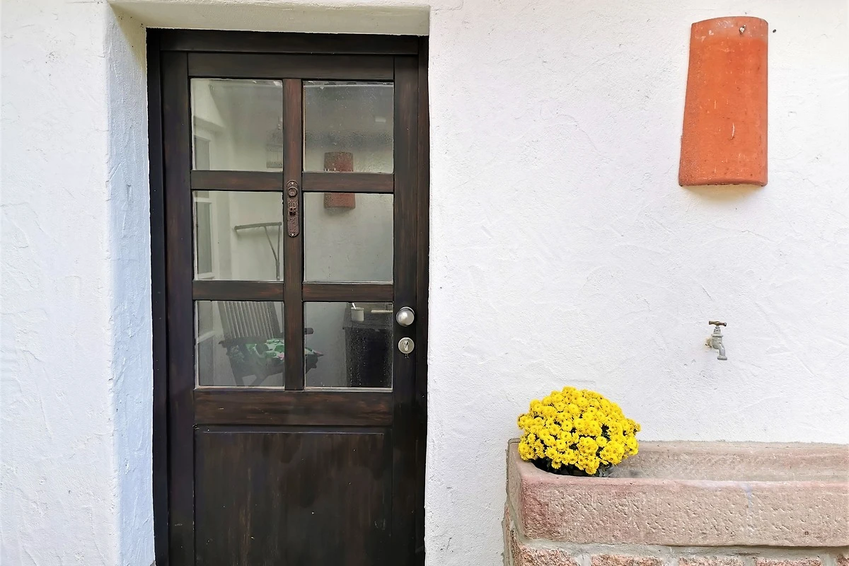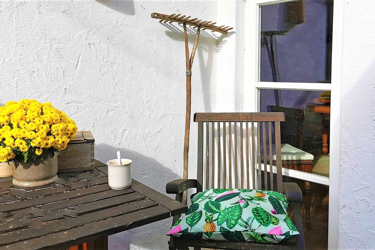 Vor der Wohneinheit befindet sich eine Terrasse mit Tisch und Stühlen, die im Sommer zum Frühstücken einlädt.