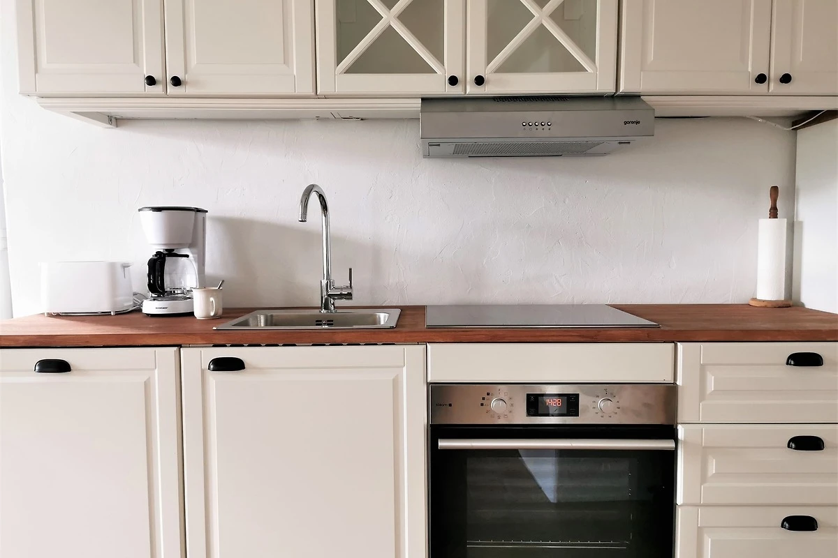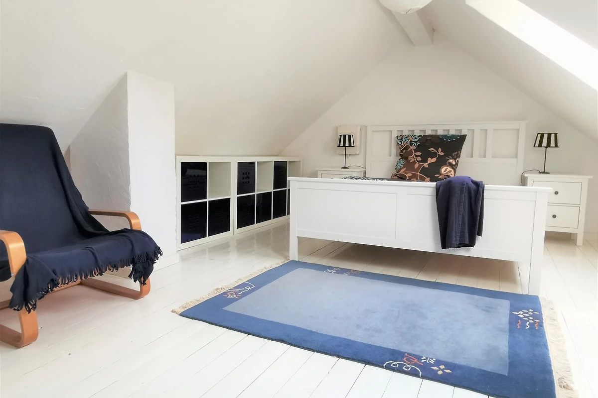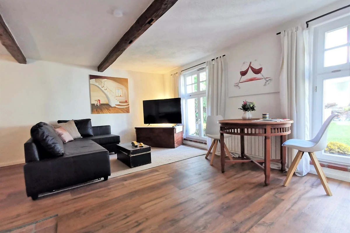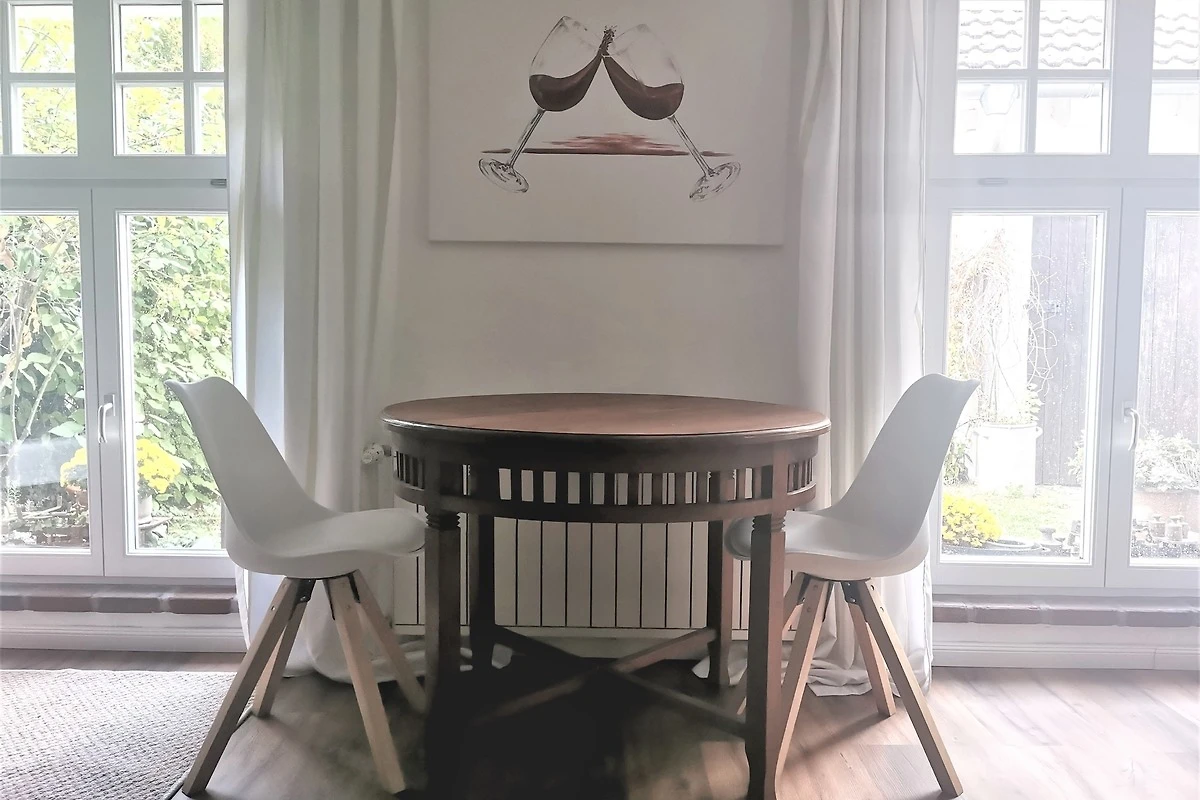 Im Erdgeschoss der Wohnung befindet sich der Wohnbereich, der mit einer bequemen Schlafcouch ausgestattet ist. Von dem Sofa haben sie einen schönen Blick in den kleinen Garten. Die Küchenzeile und der Essbereich sowie das Bad befindet sich ebenfalls im Erdgeschoss.