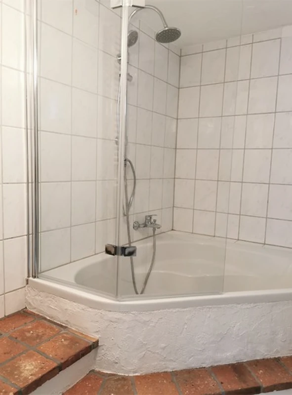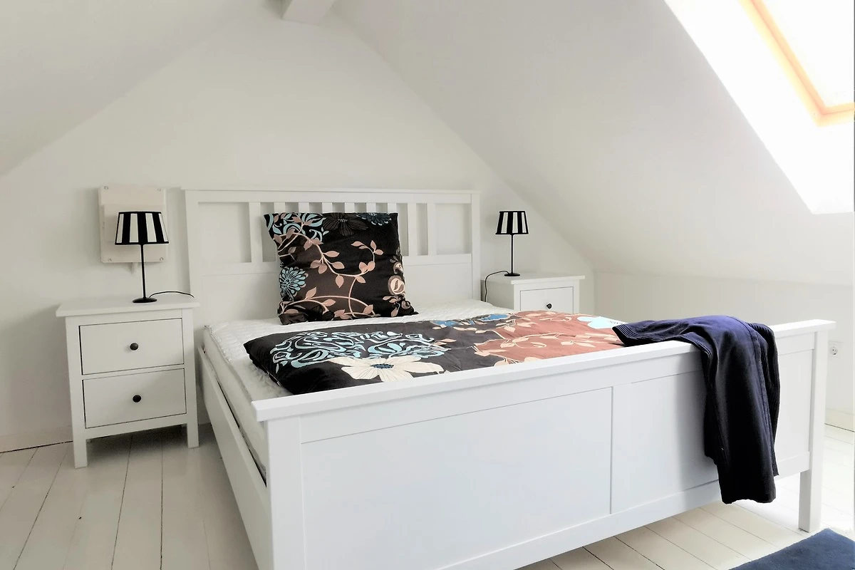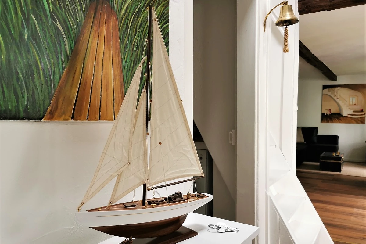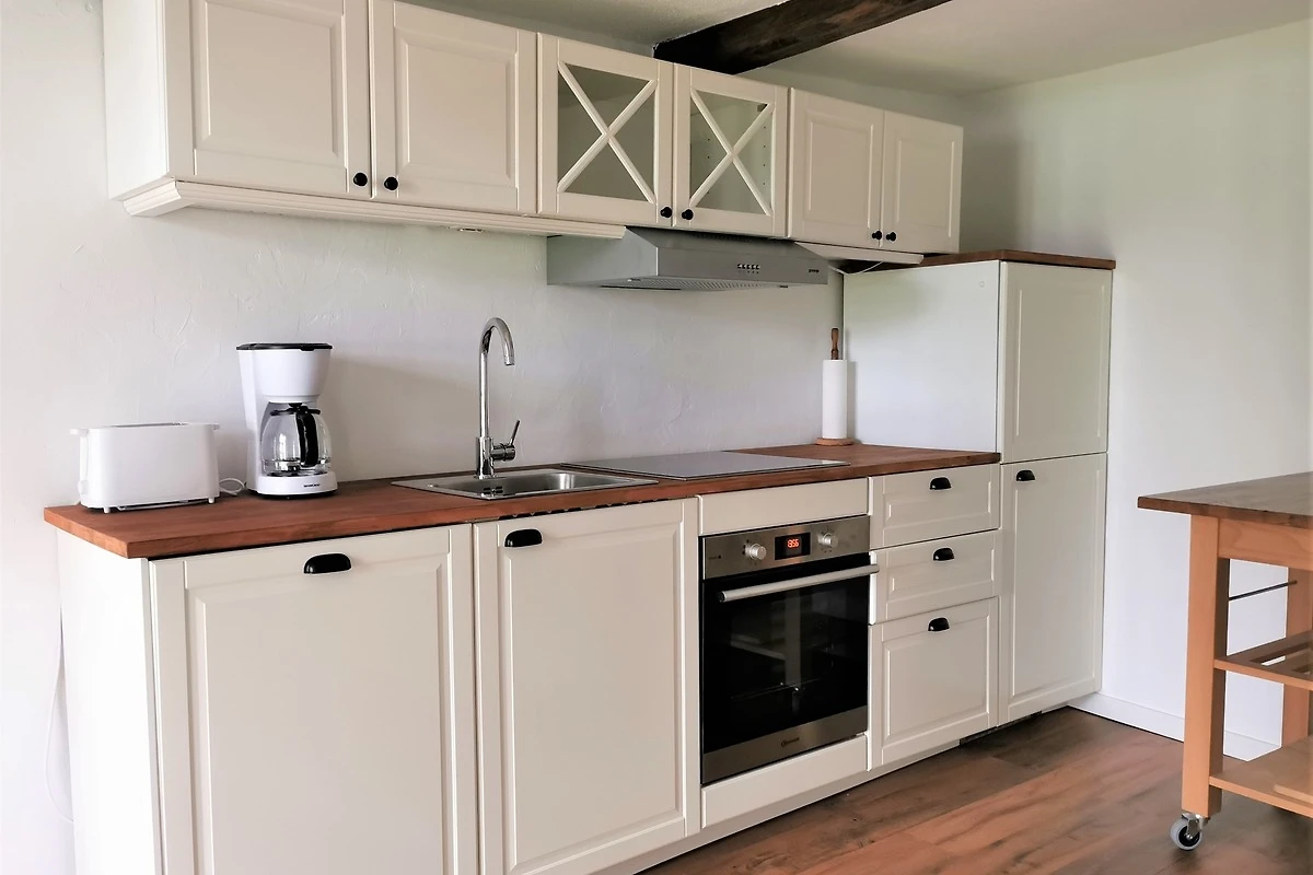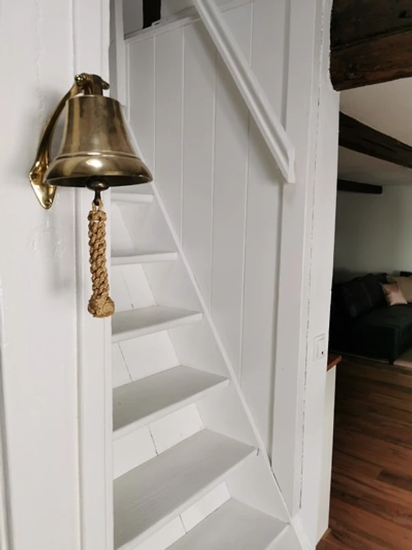 Im Erdgeschoss der Wohnung befindet sich der Wohnbereich, der mit einer bequemen Schlafcouch ausgestattet ist. Von dem Sofa haben sie einen schönen Blick in den kleinen Garten. Die Küchenzeile und der Essbereich sowie das Bad befindet sich ebenfalls im Erdgeschoss.