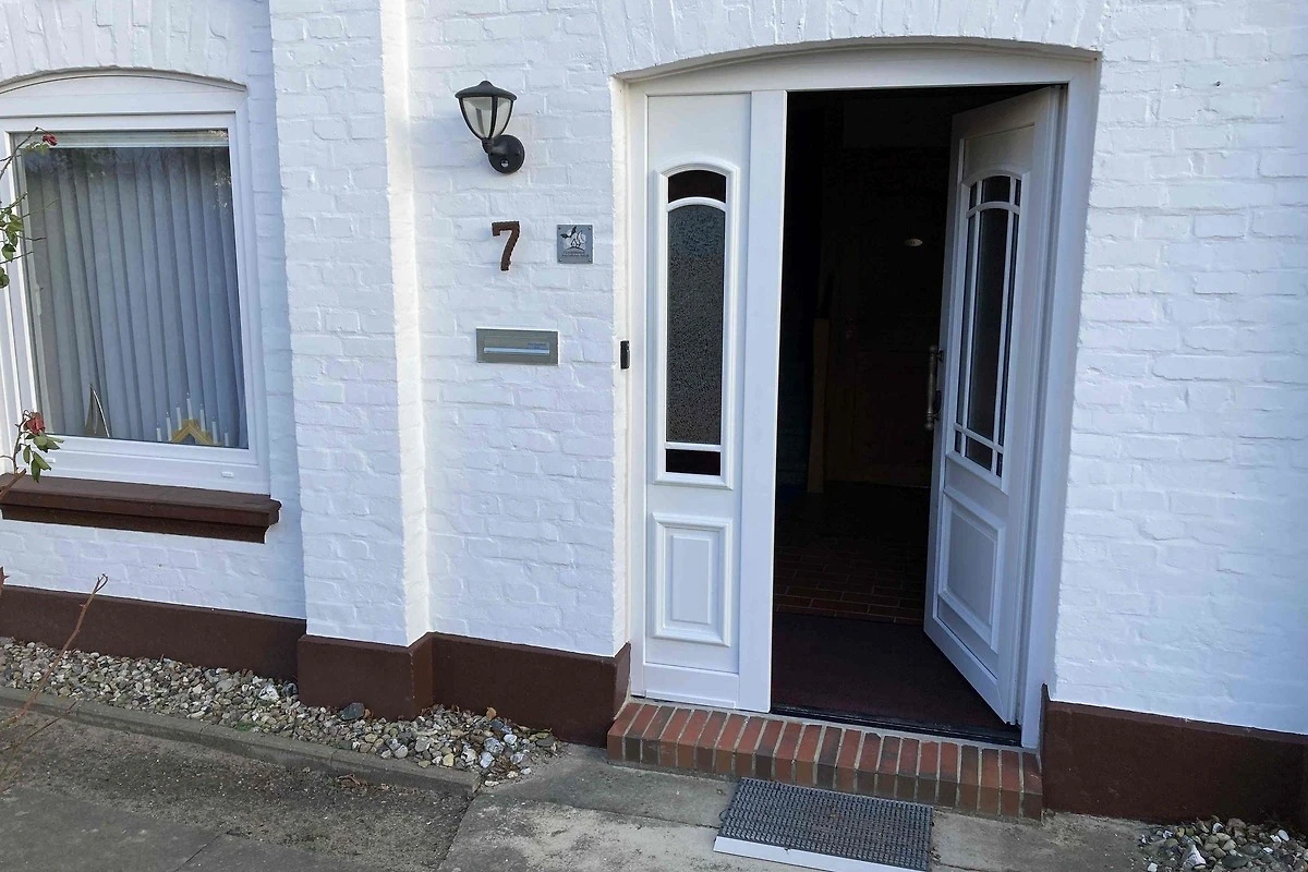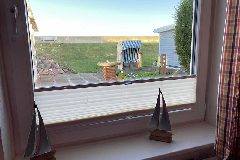 Zum Haus gehört ein einladender Garten mit grosszügigem Terrassenbereich. Hier stehen Sitzmöglichkeiten und gemütliche Strandkörbe zur Verfügung. Durch die Lage direkt am Deich lässt sich die frische Seeluft hier besonders gut geniessen.