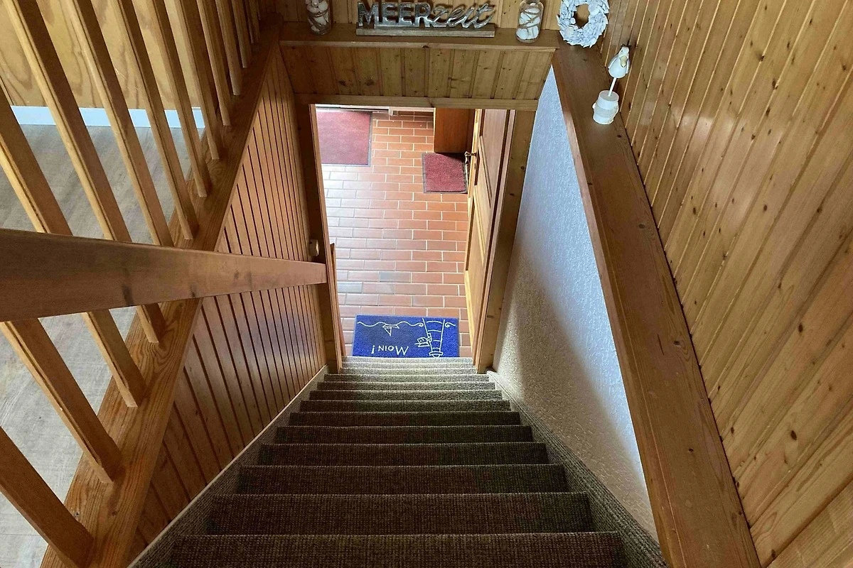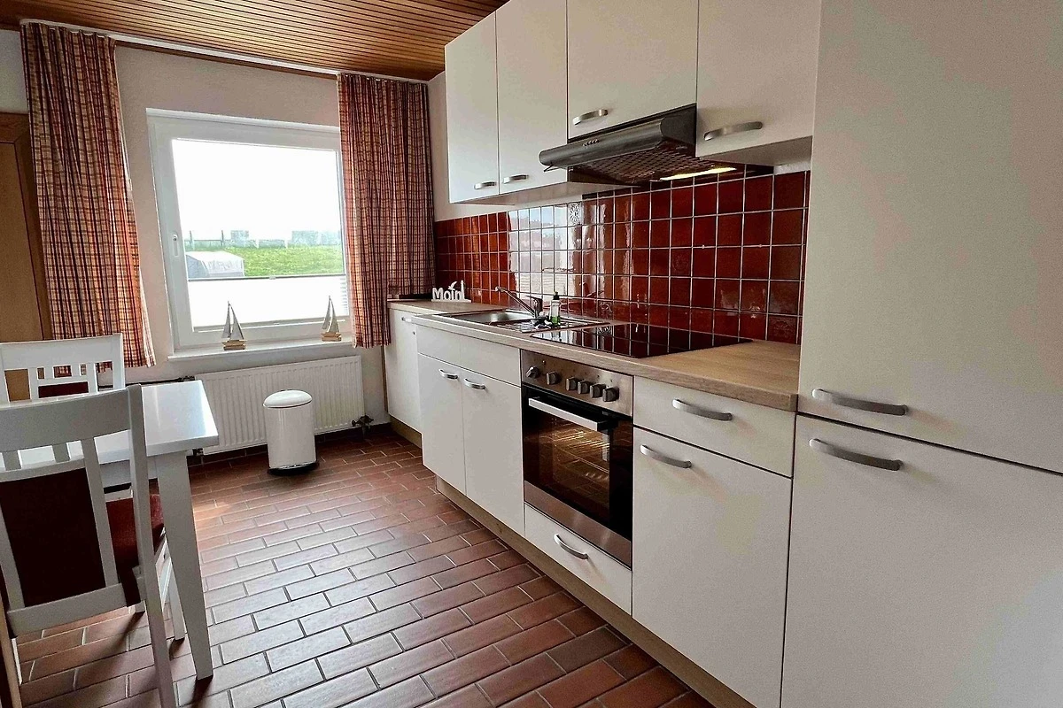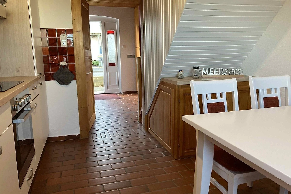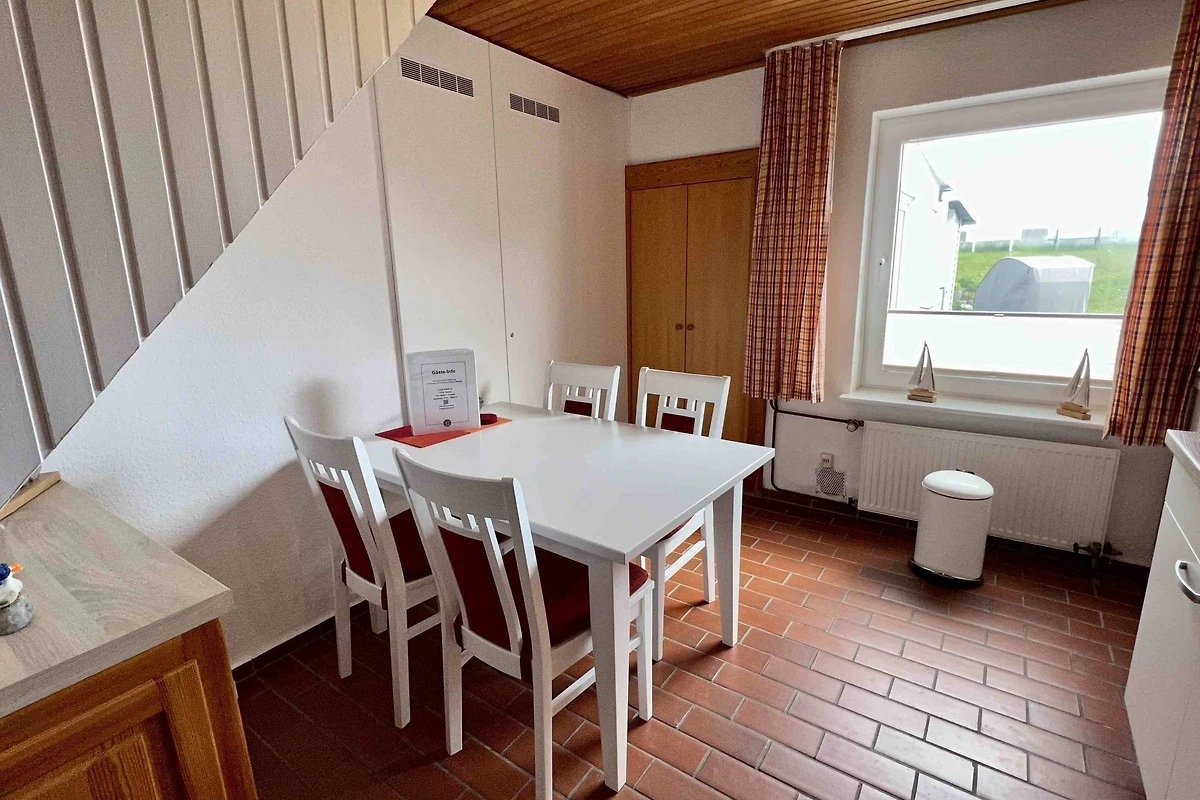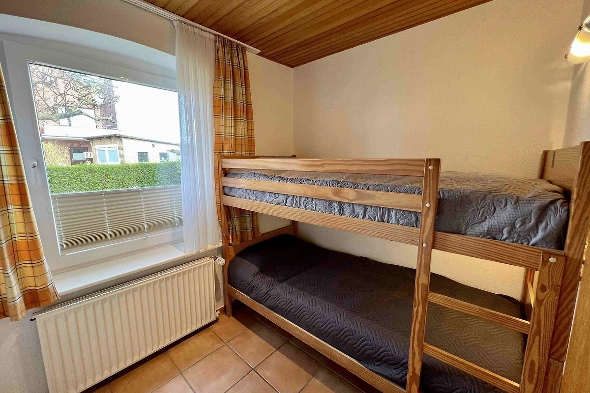 Hier finden Sie Platz für bis zu 4 Personen, und können so auch Ihren Familienurlaub verbringen. Besonders ist, dass Sie Zugang zur Küche über den Hausflur haben. Die Küche ist ausgestattet mit einem Esstisch und vier Stühlen. Die Küchenzeile verfügt einen Heissluftbackofen samt Ceranfeld, Kühlschrank mit Eisfach, Toaster, Kaffeemaschine, Wasserkocher, und Mixer. Im Kinderzimmer steht ein stabiles Etagenbett (190 x 90) für zwei Personen.