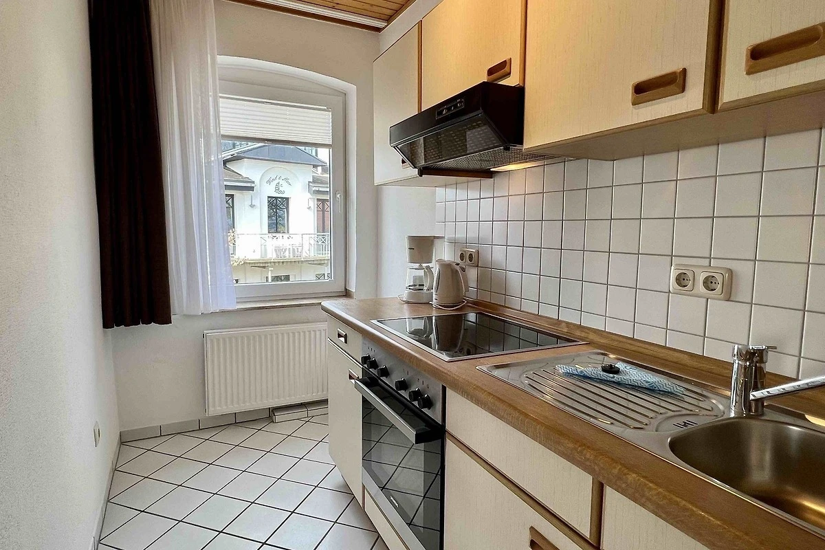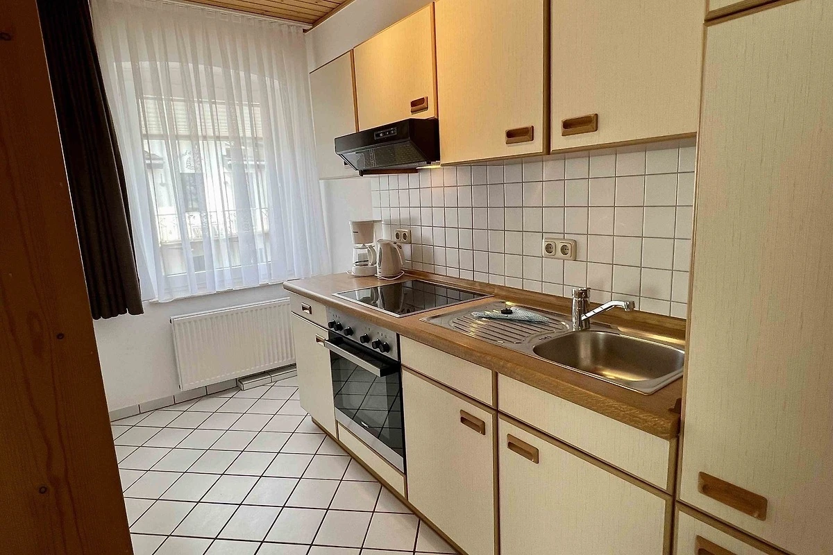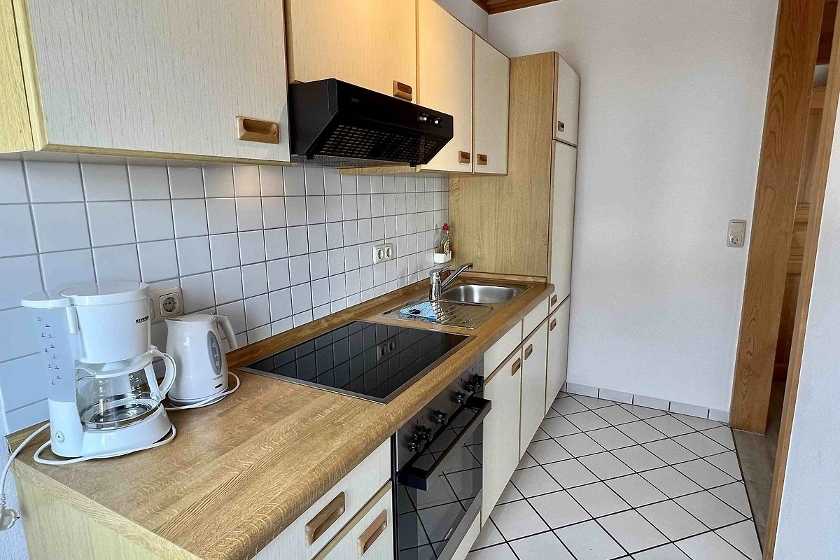 Die Küche ist für vier Personen voll ausgestattet und beinhaltet Kühlschrank mit Eisfach, 4 Platten-Ceranfeld-Elektroherd mit Heissluftbackofen, Toaster, Mixer, Kaffeemaschine und Wasserkocher.