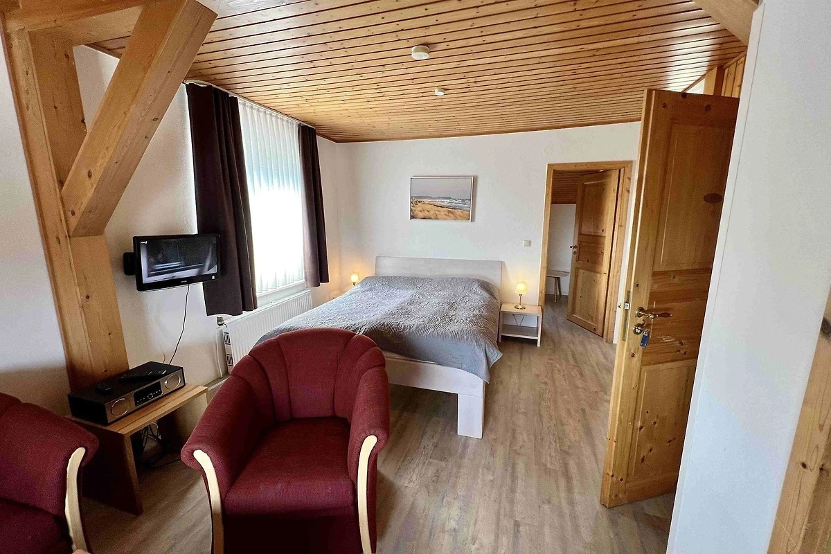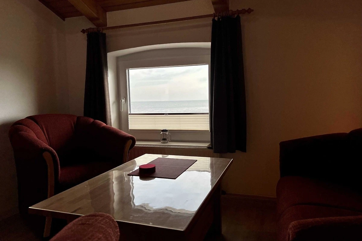 In der Zweizimmerwohnung haben Sie Meerblick nach Süden und Osten vom gemütlichen Wohnschlafzimmer aus. Zur Seeseite (Osten) befindet sich eine Polstergruppe mit einem höhenverstellbaren Tisch, an dem Sie bequem Ihre Mahlzeiten einnehmen können. Sie schlafen in einem Doppelbett (zwei Matratzen, 80 x 200) und erwachen - wenn Sie mögen - mit dem Blick auf die Ostsee. Fernsehen empfangen Sie über Digital-SAT-TV LCD-Fernseher mit HD- und USB-Anschluss, Radio/CD/USB ist vorhanden,