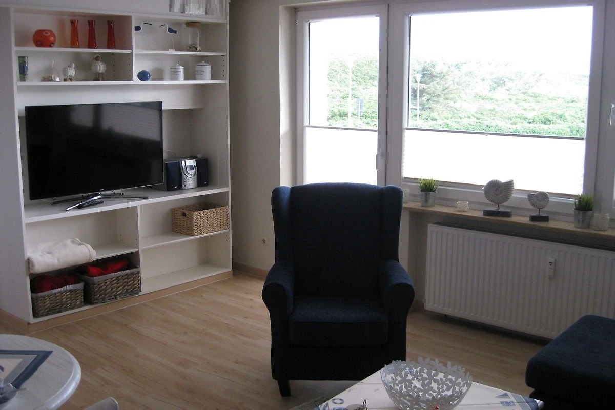 Das Wohnzimmer ist mit grossen Panorama-Fenstern ausgestattet. Sie schauen auf die Dünen Richtung Wenningstedt. Die Wohnung hat 50 qm Wohnfläche. Die Wohnung ist hell und exklusiv eingerichtet.