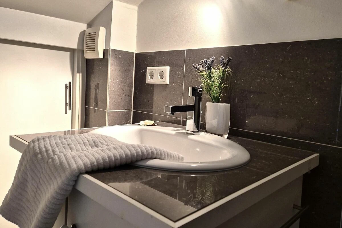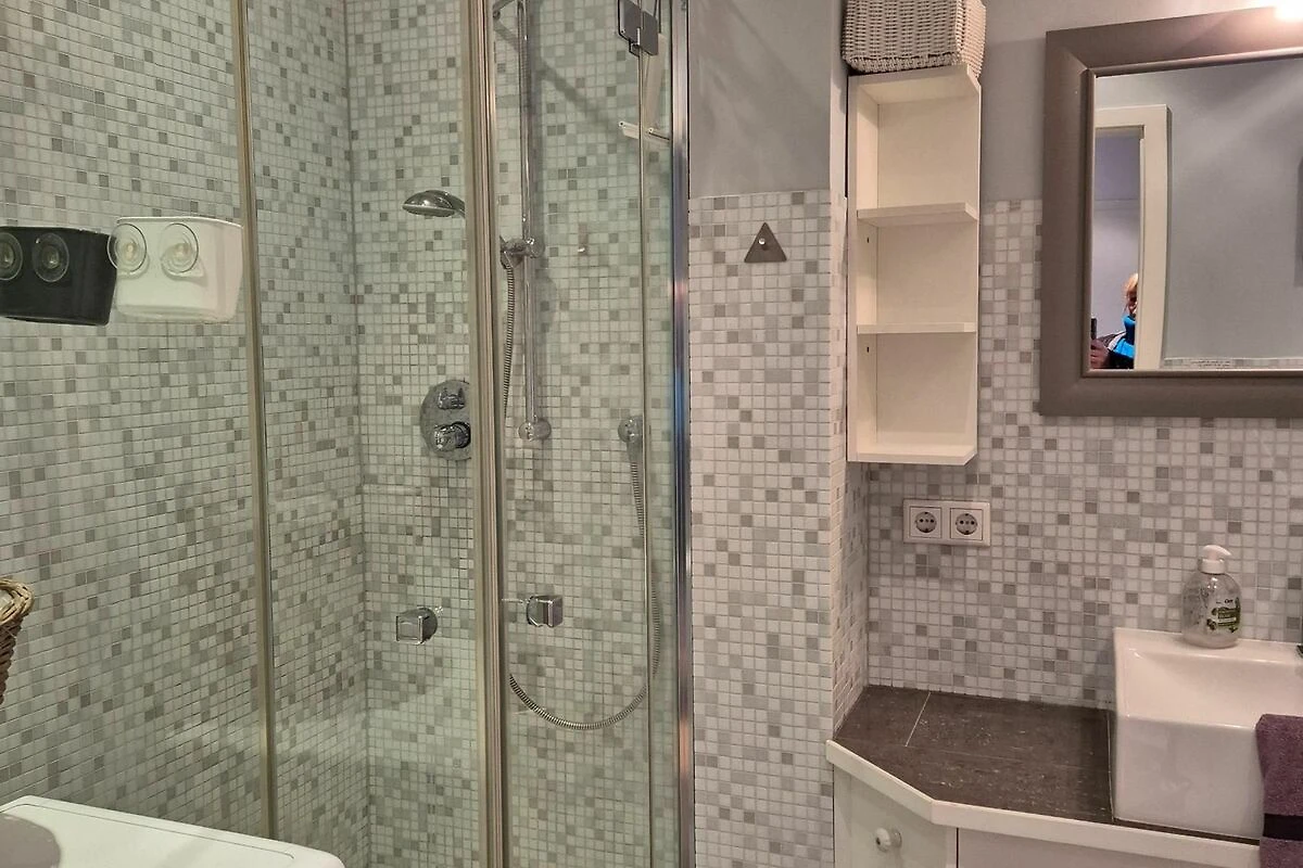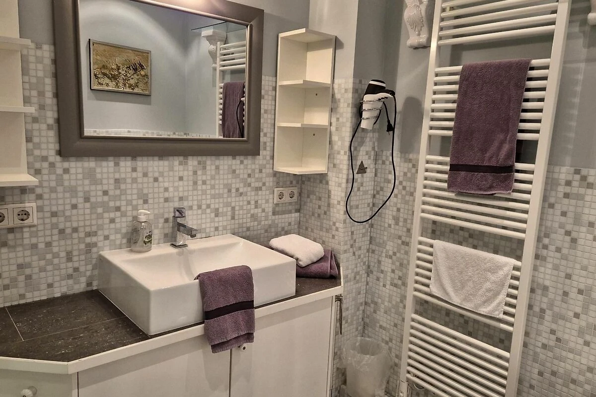 Sanitär: bodenebene Dusche, Föhn, Handtuchheizkörper, Schminkspiegel.
