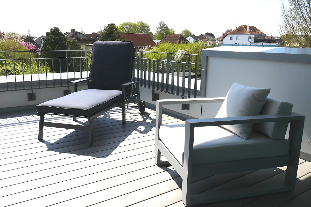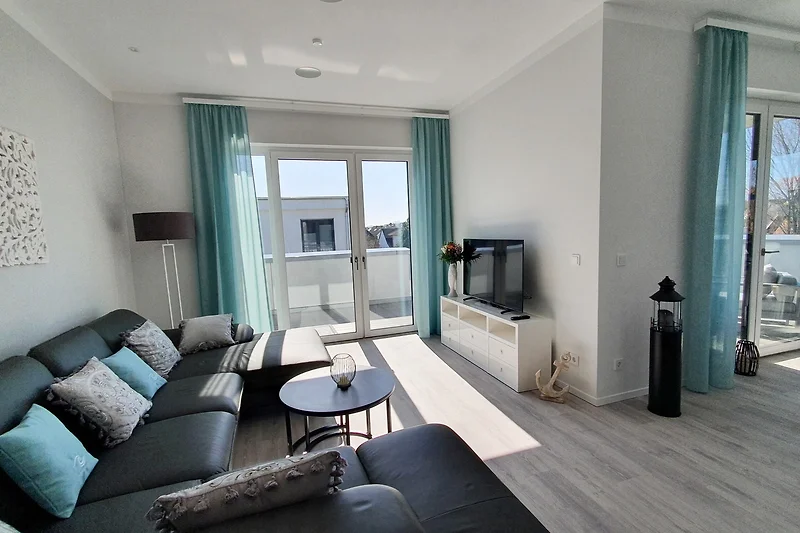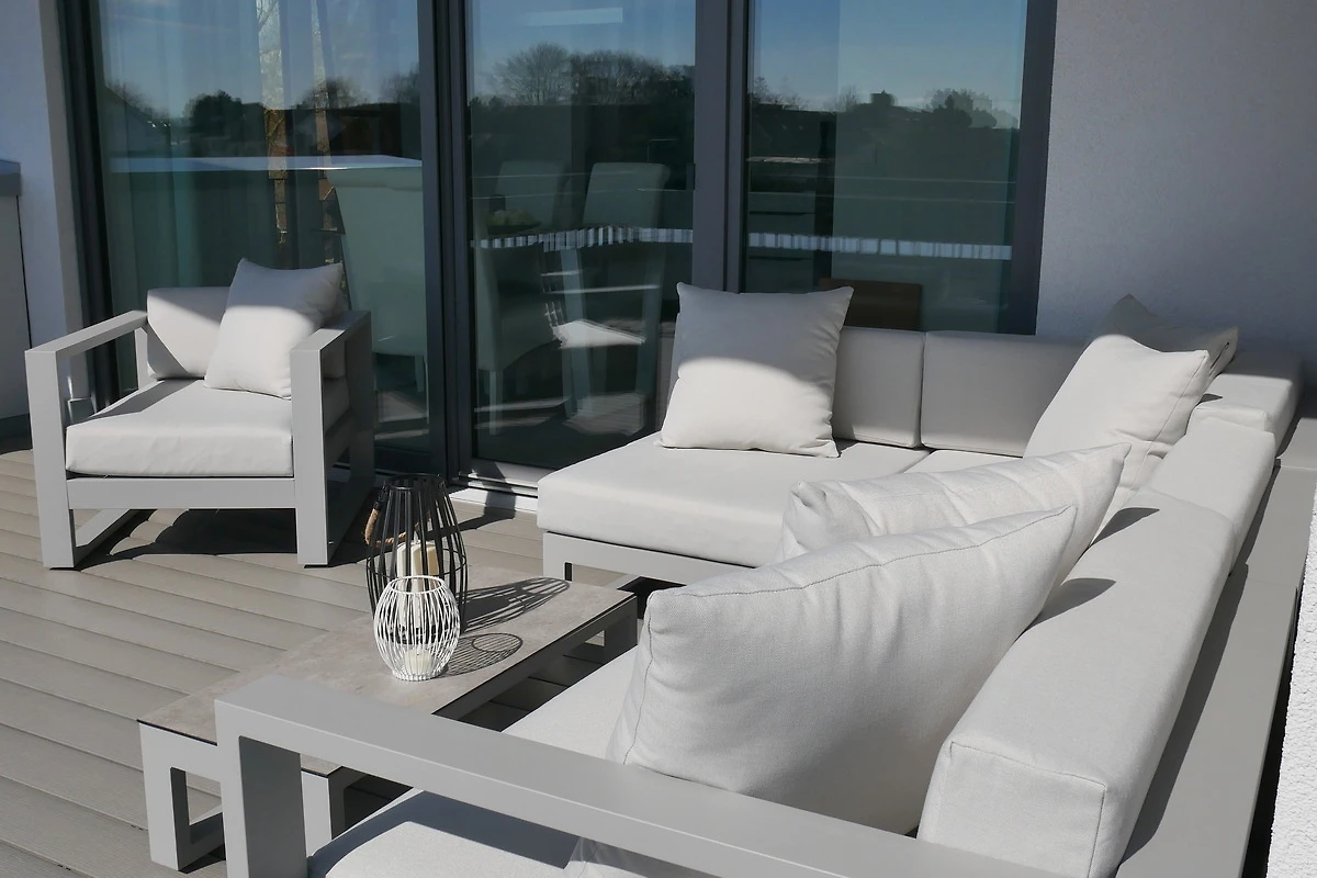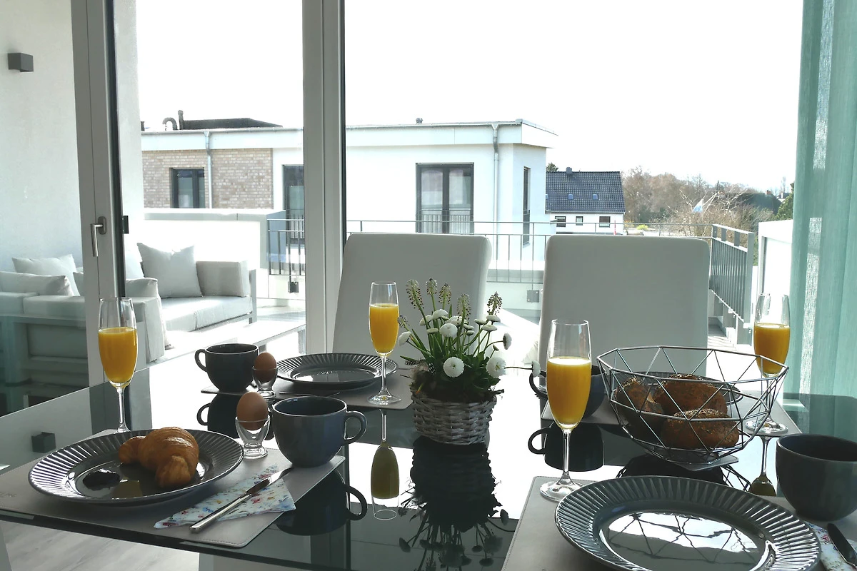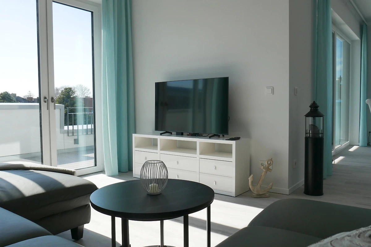 Die 3-Zimmer Ferienwohnung ist geschmackvoll eingerichtet und mit entsprechendem Ambiente geschmückt. Helle lichtdurchflutete Zimmer durch grosse Fenster-/Türfronten geben den Wohnräumen einen besonderen Wohlfühlfaktor. Die Wohnung verfügt über zwei Schlafzimmer, Wohn / Esszimmer mit eleganter offener Küche und direktem Zugang zur grossen 28m² Dachterrasse. Die schöne Süd-/West Dachterrasse ist mit modernen Loungemöbeln, Sonnenliege und einem Sonnenschirm ausgestattet.