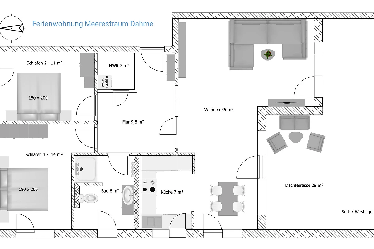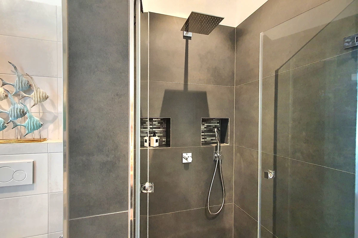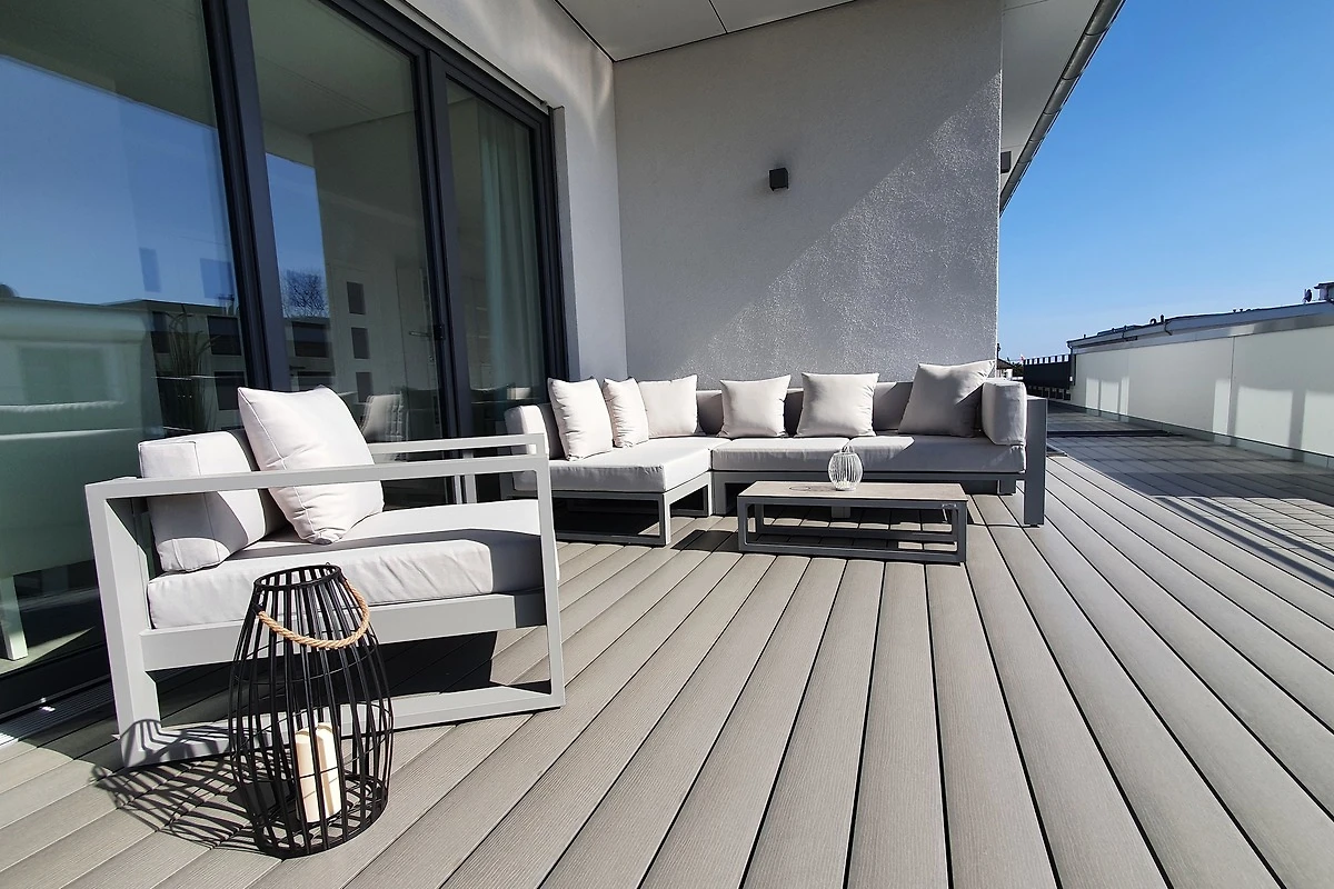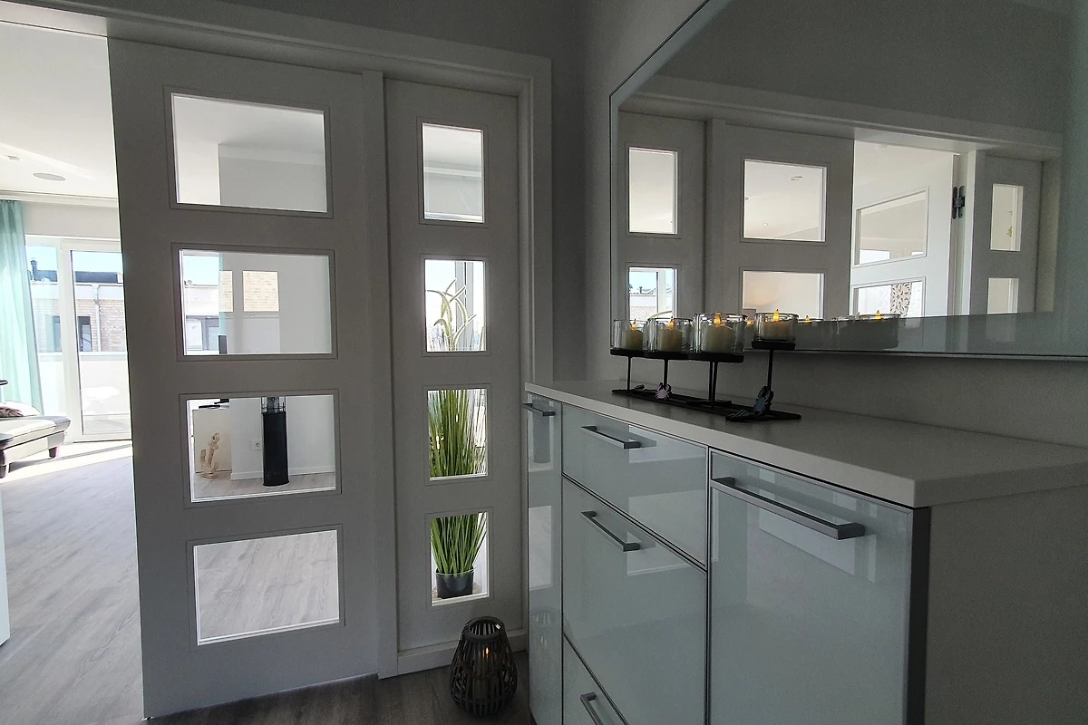 Die 3-Zimmer Ferienwohnung ist geschmackvoll eingerichtet und mit entsprechendem Ambiente geschmückt. Helle lichtdurchflutete Zimmer durch grosse Fenster-/Türfronten geben den Wohnräumen einen besonderen Wohlfühlfaktor. Die Wohnung verfügt über zwei Schlafzimmer, Wohn / Esszimmer mit eleganter offener Küche und direktem Zugang zur grossen 28m² Dachterrasse. Die schöne Süd-/West Dachterrasse ist mit modernen Loungemöbeln, Sonnenliege und einem Sonnenschirm ausgestattet.