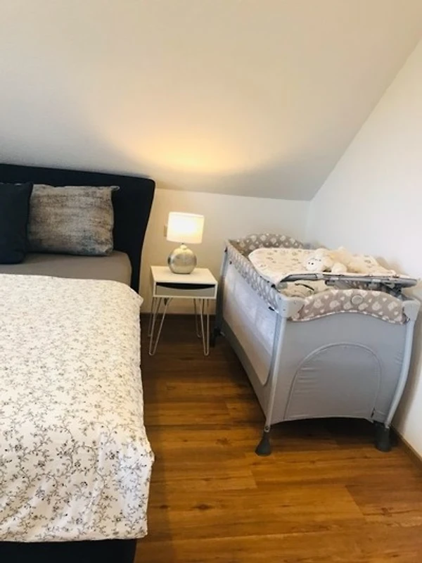 Drei Schlafzimmer mit bequemen Boxspring- und Einzelbetten sorgen für erholsamen Schlaf. Für Familien stehen zusätzlich ein Hochstuhl, Wickeltisch, Babybadewanne und ein Kinderbett bereit.