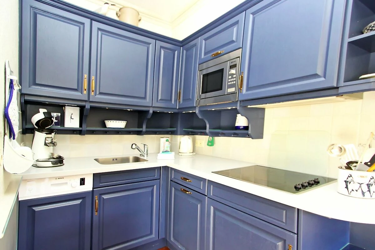 Die voll ausgestattete Küche verfügt über ein vier Platten Cerankochfeld, Geschirrspüler, Mikrowelle, Kühlschrank sowie alle Utensilien, die benötigt werden, um sich selbst zu versorgen. Vom Flur mit Garderobe geht ein Schlafzimmer ab. Dort stehen zwei Einzelbetten mit kleinen Nachttischen und ein grosser Einbaukleiderschrank, der ausreichend Stauraum bietet. Vom Wohnzimmer gelangen Sie über eine Treppe ins Untergeschoss. Dort befindet sich neben dem Duschbad/WC der zweite Schlafraum. Dieser verfügt über ein Doppelbett, Nachttische und ein Fenster. Durch den Lichtschacht kommt Tageslicht hinein. Im Flur sind ebenfalls Einbauschränke.