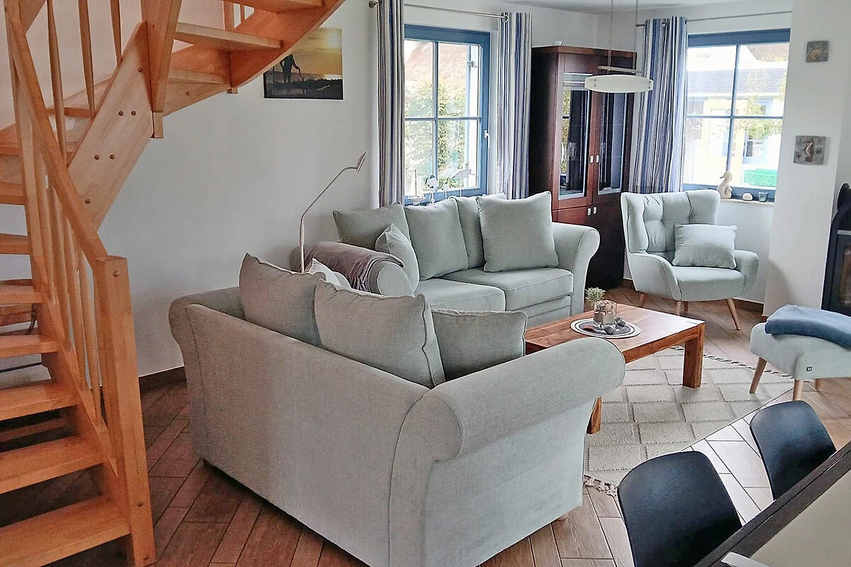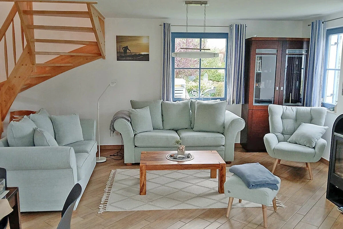 Erdgeschoss: großzügiger Wohn-, Essbereich mit Kamin und Fußbodenheizung, gemütliche Couchlandschaft mit Schlaffunktion ( 180 x 135 cm ) und Sessel, Smart-TV, Blu-ray Player, Internet (WLAN), Gesellschaftsspiele und Bücher für gemütliche Abende, komplett ausgestattete hochwertige Einbauküche mit 4-Plattenherd (Ceran), Backofen, Kühlschrank mit kleinem Gefrierfach, Geschirrspüler, Mikrowelle, Filterkaffeemaschine und Senseo Padmaschine und diversen Elektrogeräten, Zugang zum Wintergarten, 1. Badezimmer mit Dusche/WC, Sauna, Hauswirtschaftsraum mit Waschmaschine, Wäscheständer, Bügelbrett, Bügeleisen, Staubsauger und Kinderhochstuhl