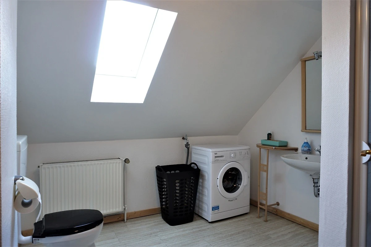 - ein Badezimmer mit Dusche und Wc, sowie eine Waschmaschine + Föhn