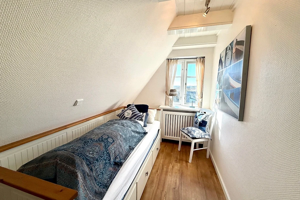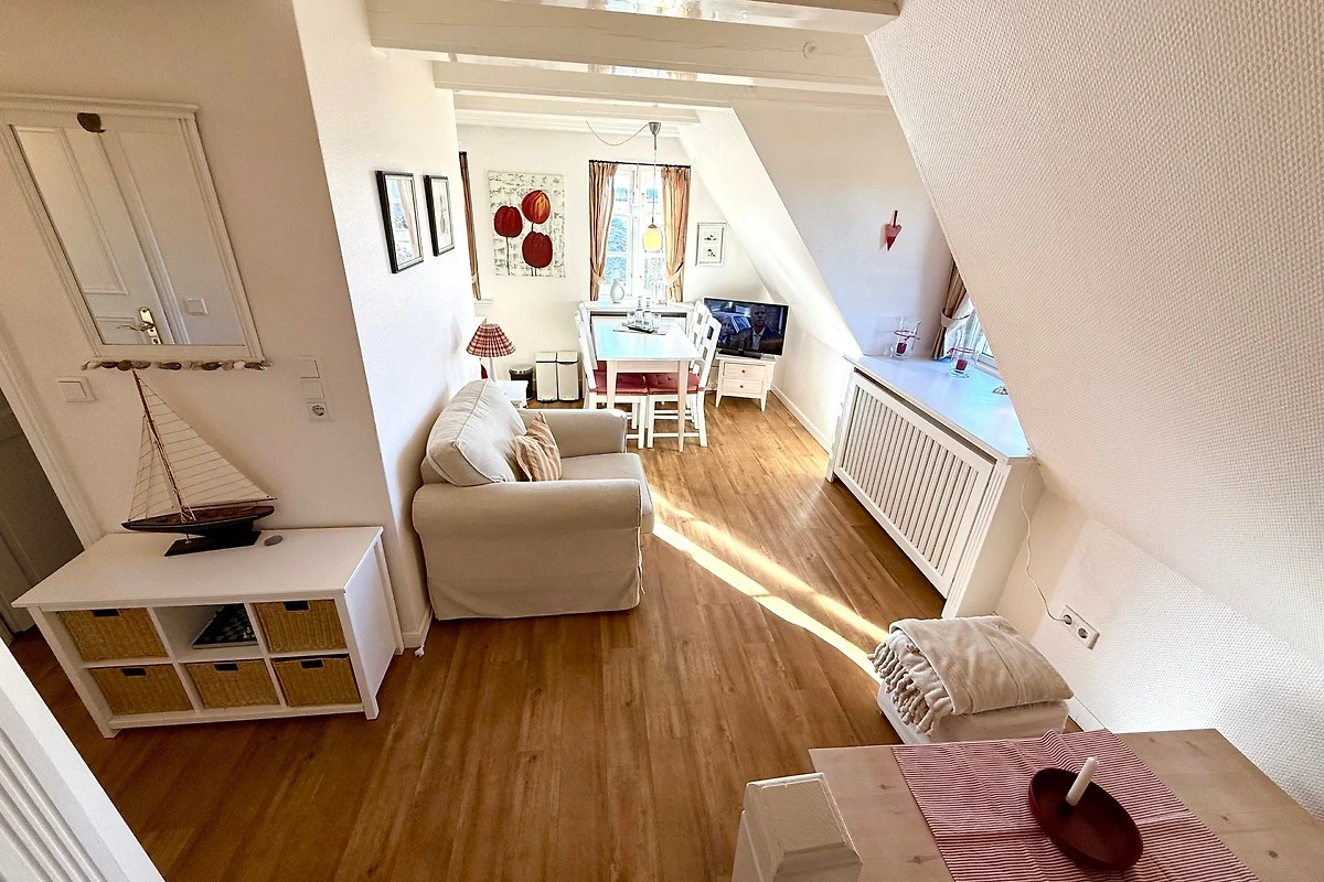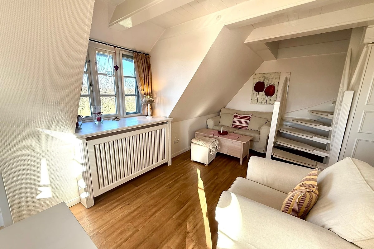 Diese attraktive Reetdach-Obergeschoss-Wohnung (50 m²) für 3 Personen in einem Einzelhaus mit 4 Wohneinheiten im Deichhof besticht durch Ruhe und Gemütlichkeit auf hohem Wohnniveau. Über die Diele gelangen Sie in das moderne Duschbad. Auf der linken Seite empfängt Sie ein "kleines" Schlafzimmer mit einem Einzelbett. Anschliessend ersteckt sich der gemütliche, helle Essbereich mit modern ausgestatteter Küche und grosszügigem Wohn-Wohlfühlbereich, der zu einem erholsamen und entspannenden Miteinander einlädt. Über eine Freitreppe gelangen Sie in den grosszügigen Schlaf und Galeriebereich. Zu dieser Wohnung gehört ein PKW Stellplatz am Haus. In wenigen Fussmetern erreichen Sie den Hauswirtschaftsraum mit Waschmaschinen und Trocknern, auch zu Ihrer Verfügung. Im rückwärtigen Bereich steht Ihnen eine Picknickwiese mit Grillplatz und Sitzbänken zur Verfügung. Gleich daneben können sich Ihre Kinder auf dem grossen Spiel- und Fussballplatz austoben. Vom Objekt aus haben Sie einen perfekten Ausgangspunkt für lange Spaziergänge am Strand und zur Wattwanderung nach Amrum, Fahrradtouren zu den Nachbarorten und in die Marsch und zu dem wohl schönsten Sonnenuntergang der Nordseeregion. Der Deichhof ist in der Gemeinde Dunsum angesiedelt, die im Westen der Insel Föhr liegt. Er liegt an der verkehrsberuhigten Ortsdurchfahrtstrasse und reicht bis zu den weitläufigen Wiesenflächen, die direkt an den 500 m entfernt liegenden Deich der Nordsee reichen, mitten in die Natur eingebettet. Der Deichhof kann somit als Oase der Ruhe und Natürlichkeit betrachtet werden.