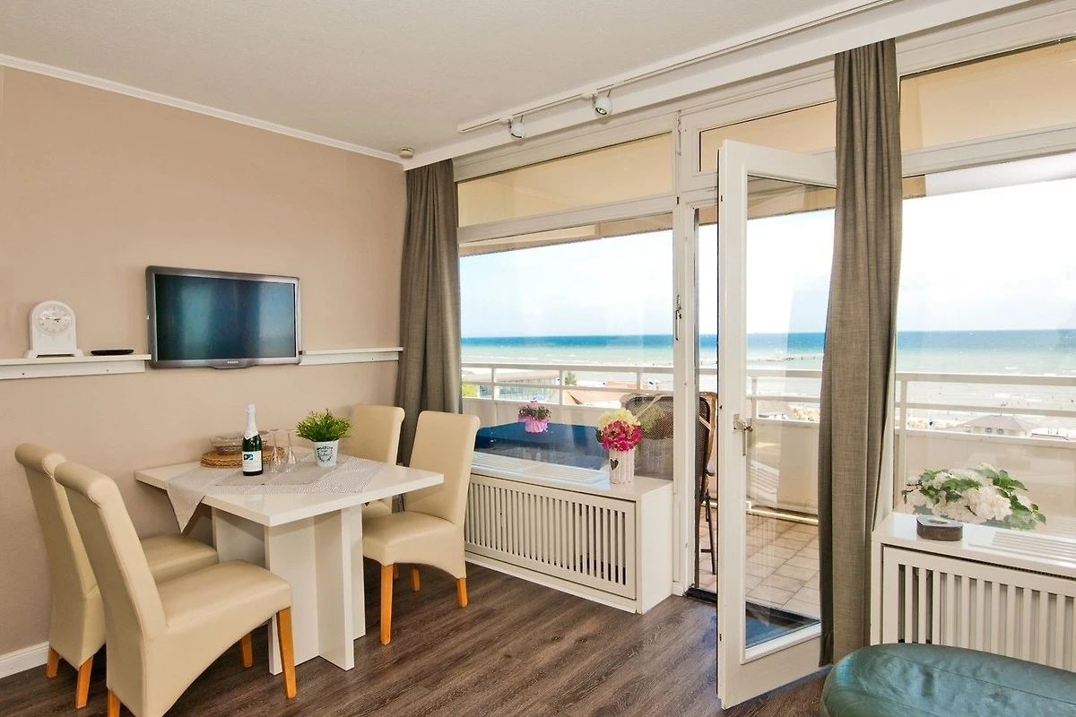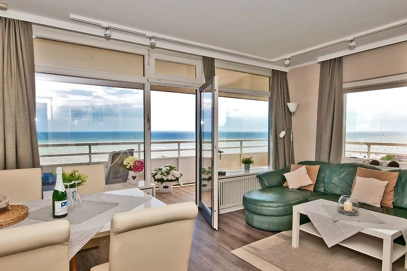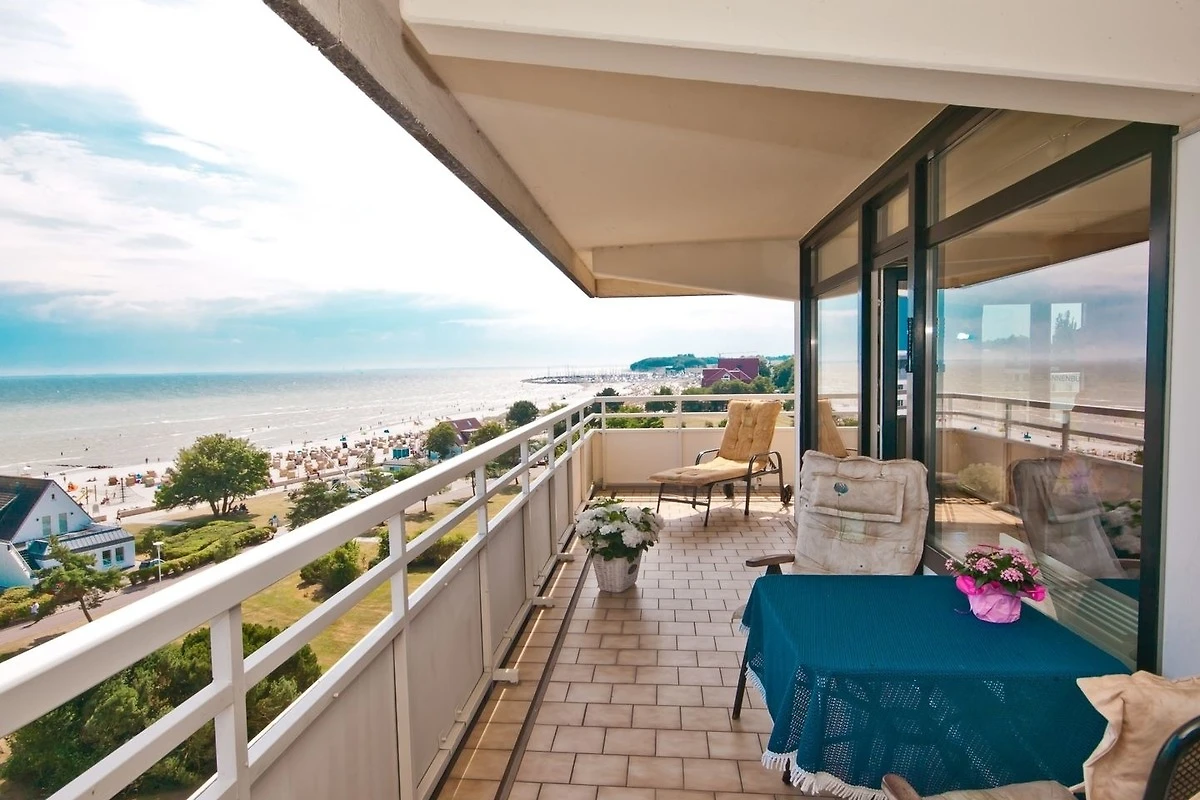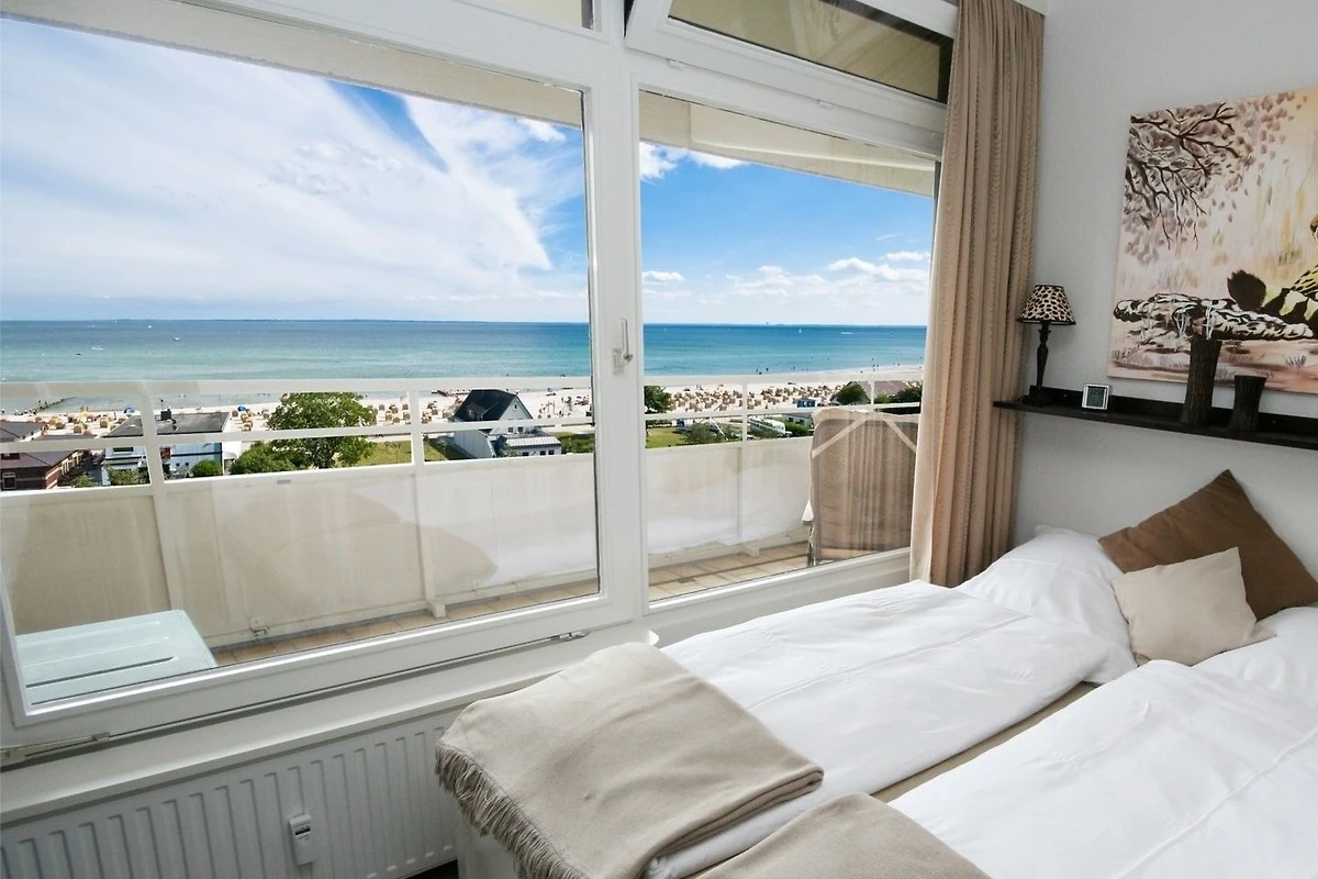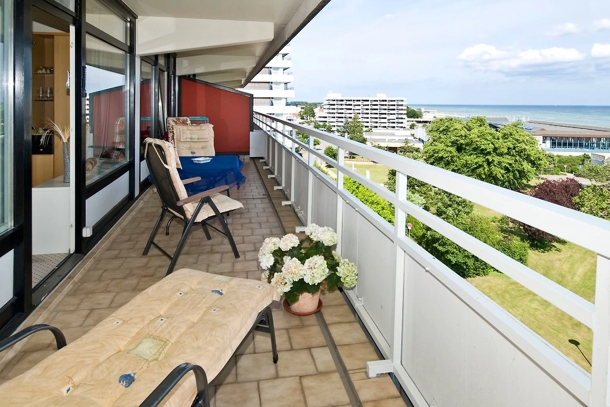 Diese wunderschöne Ferienwohnung in der 7. Etage verfügt über drei Zimmer, Meerblick aus jedem Zimmer und einem rundumlaufenden Eckbalkon (ca. 35 m²).