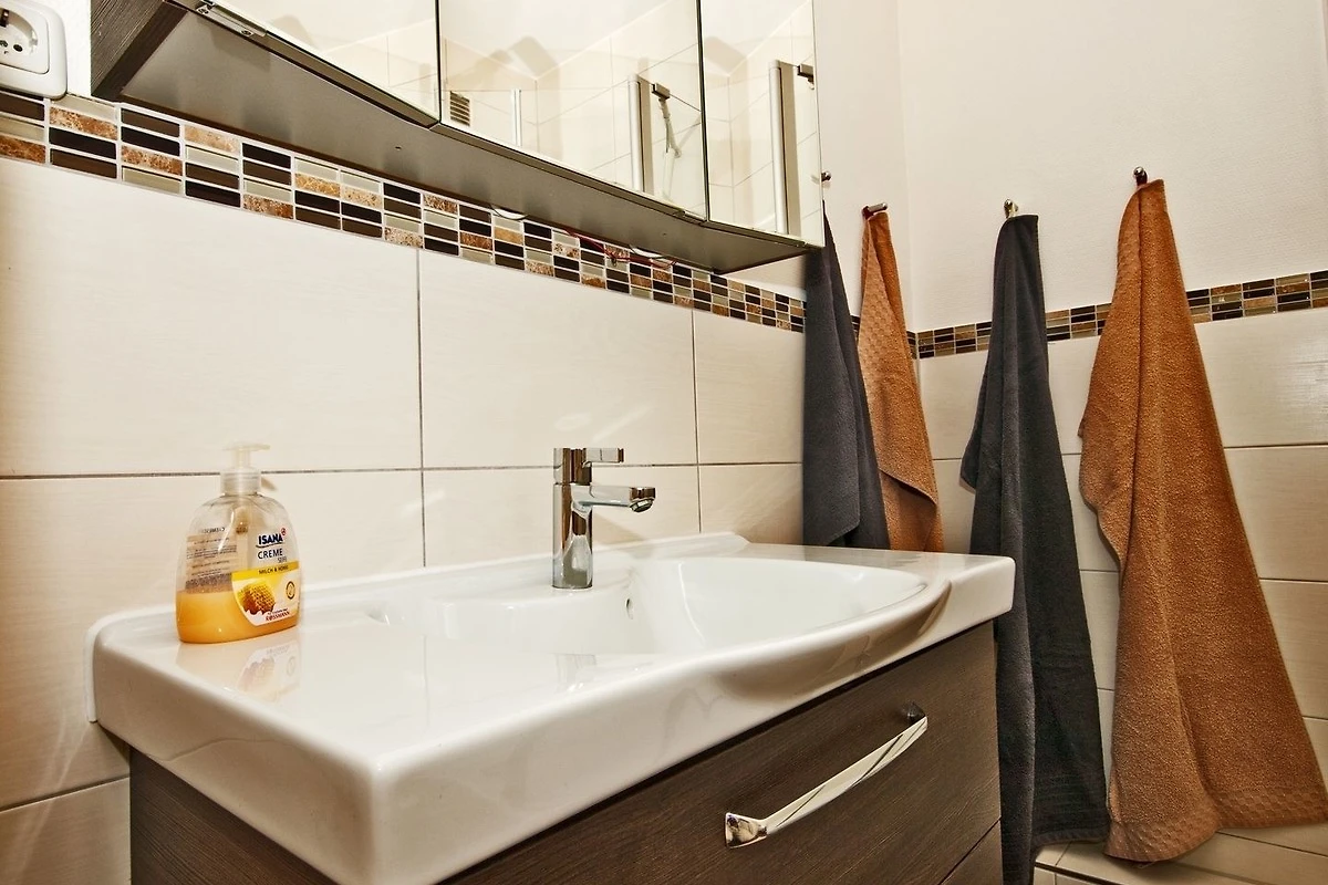 Die Wohnung ist mit Design-Planken und Fliesen ausgelegt. Verdunkelungsvorhänge befinden sich in den Schlafräumen.