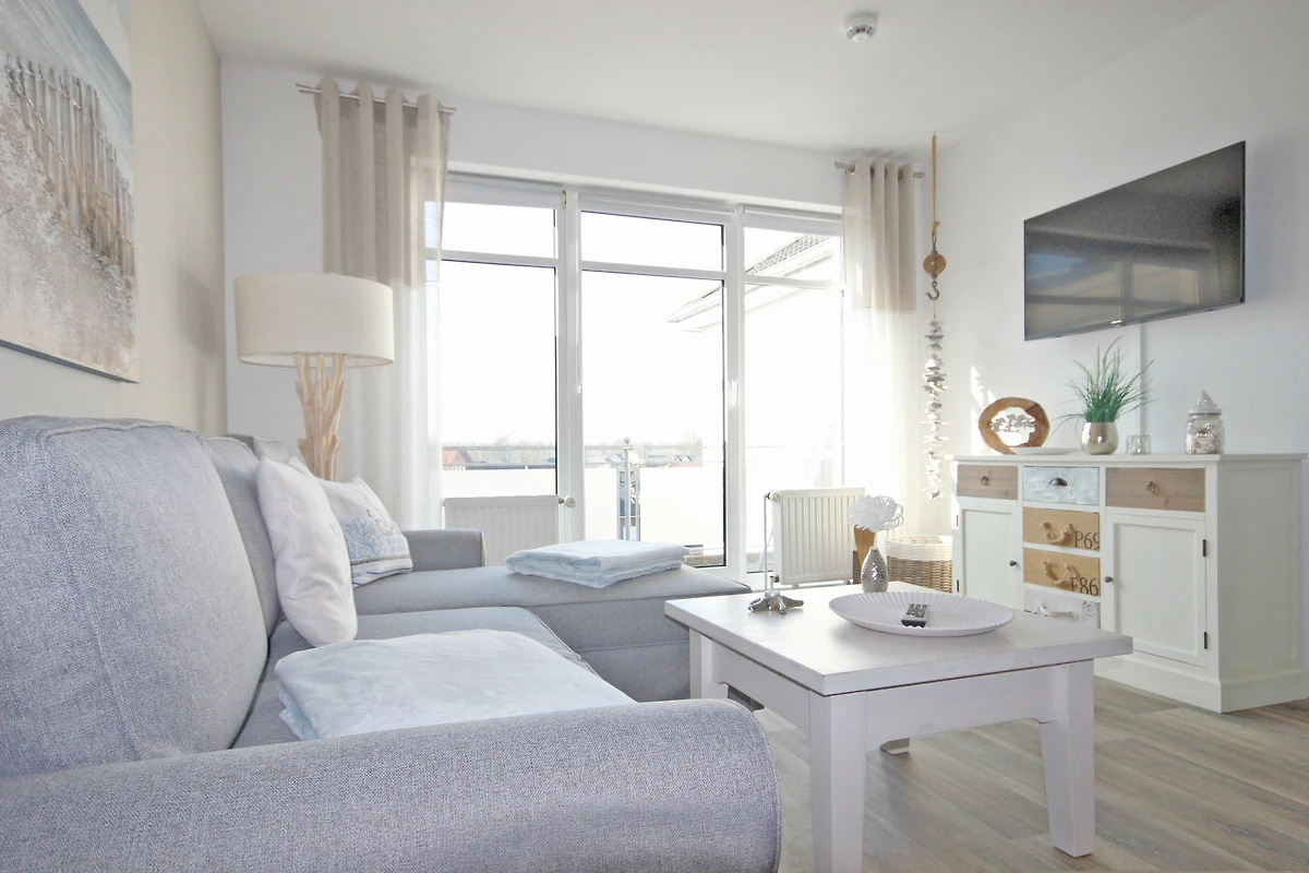 Der gemütliche, neu eingerichtete, helle Wohnraum ist mit einer Couch (ausziehbar als Bett für 1 Personen), Sideboard, Essplatz, TV & Radio ausgestattet. Hier haben Sie Zugang zum sonnigen, möblierten Süd-Balkon.
