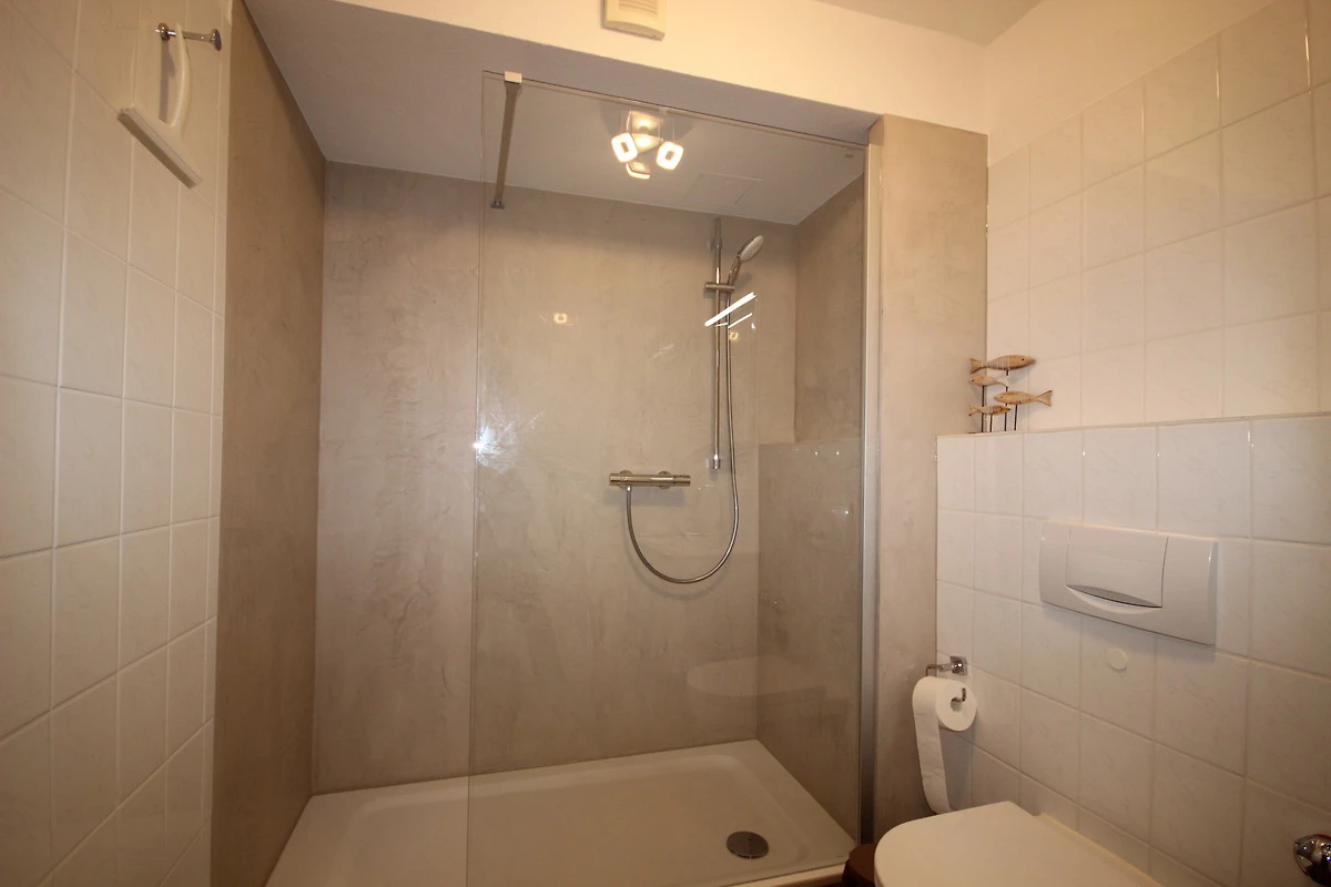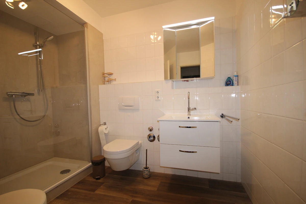 Das helle, innen liegende Badezimmer hat einen grosszügig gestallteten Duschbereich mit Glastrennwand, modernen Waschtisch mit Unterschrank, Spiegelschrank und WC.