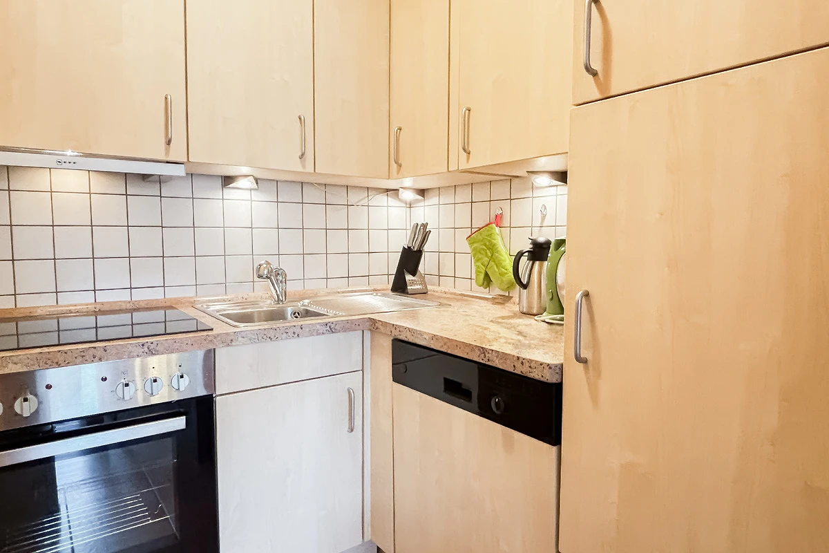 Die innenliegende Küche ist mit E-Herd- 4 Platten, Backofen, Kühlschrank mit Gefrierfach, Spülmaschine und allen üblichen Küchengeräten sehr gut ausgestattet.