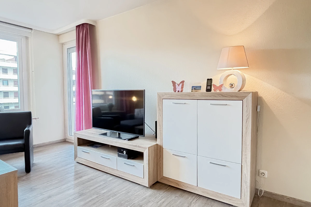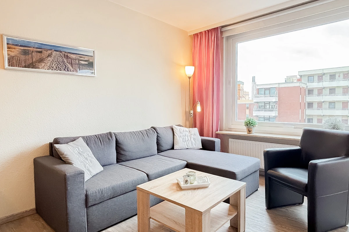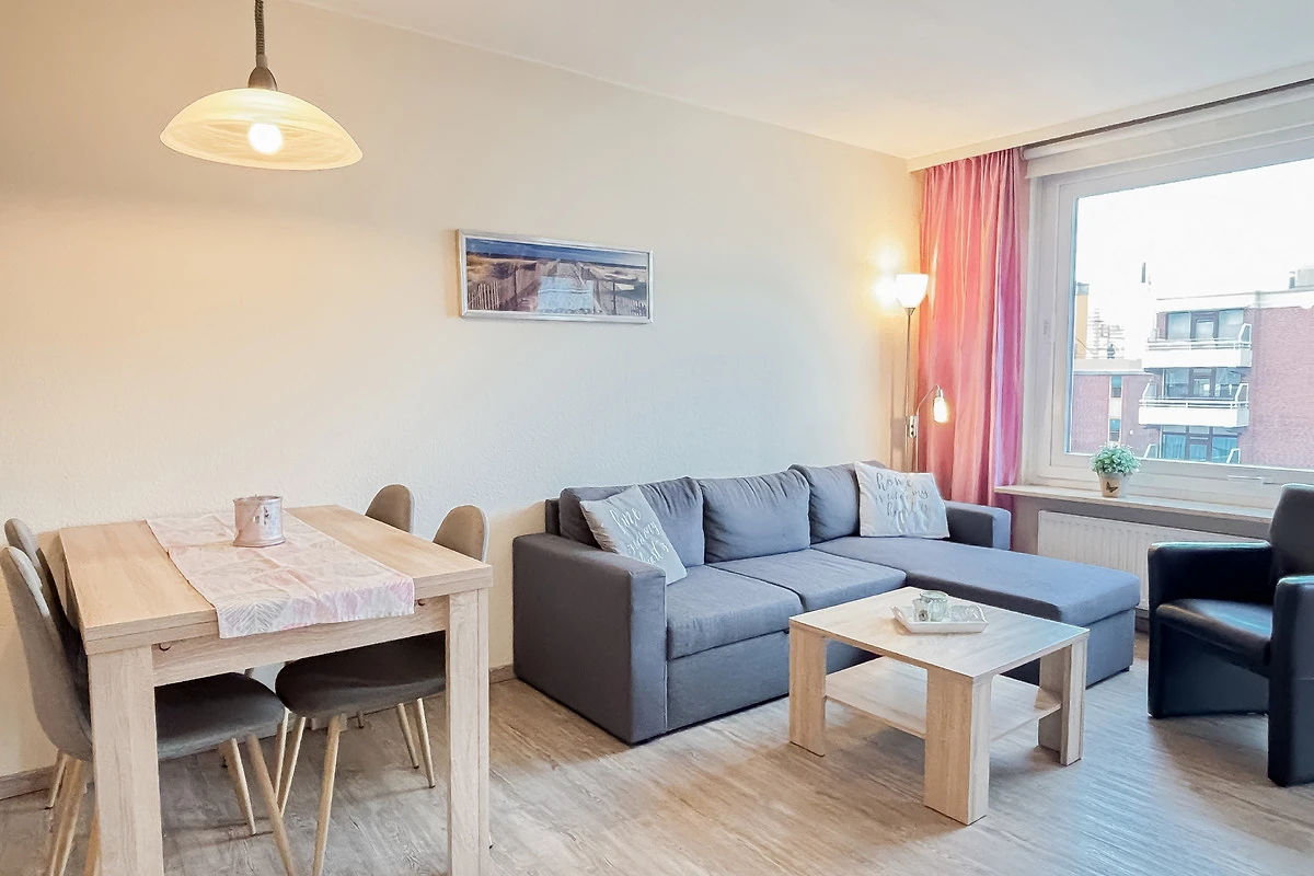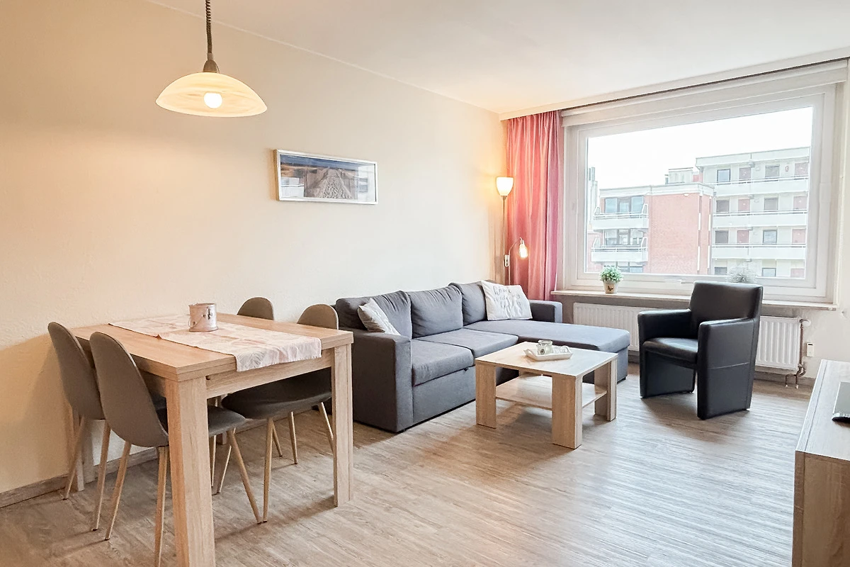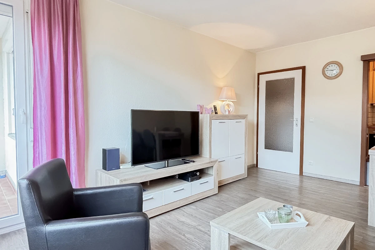 Im gemütlichen, modernen Wohnzimmer befindet sich eine bequeme Couch (ausziehbar zum Schlafen für 2 Pers.), HiFi, TV, Essecke & Zugang zum sonnigen, möblierten Süd-Ost-Balkon. WLAN vorhanden