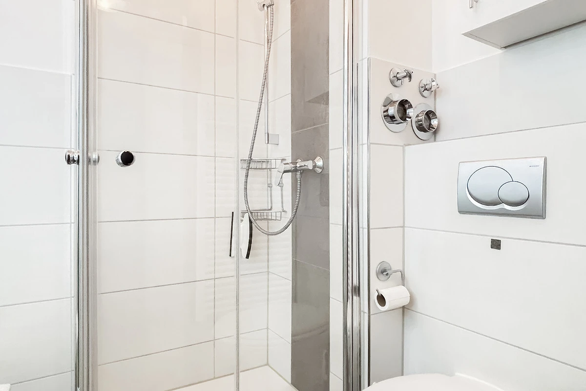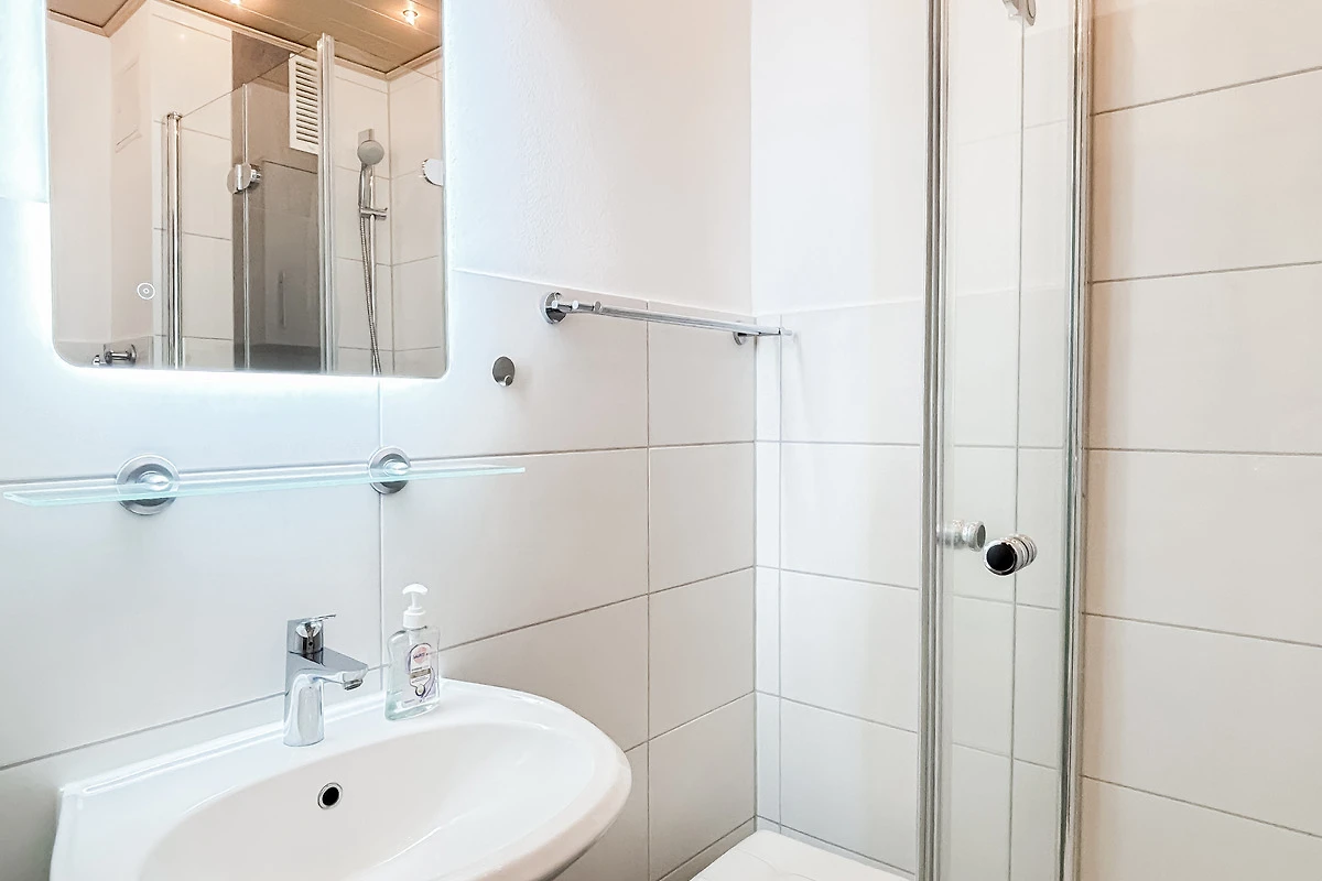 Helles, freundliches Bad mit Duschkabine, WC & Waschtisch.
