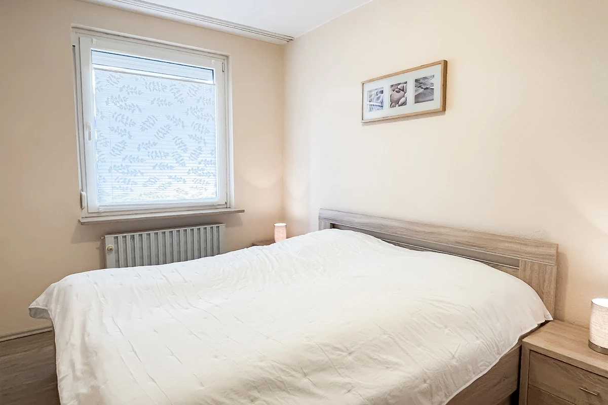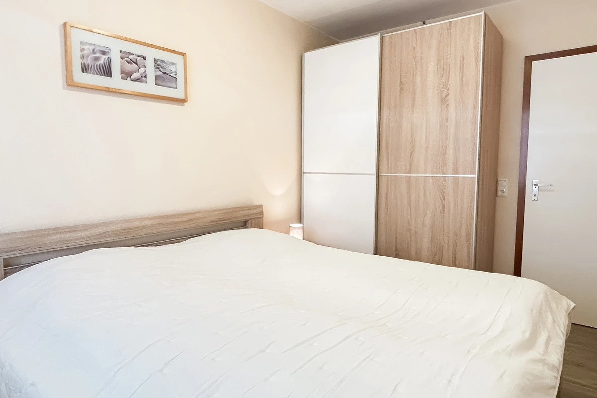 Das neue, helle Schlafzimmer ist mit einem komfortablen Doppelbett & Kleiderschrank möbliert.