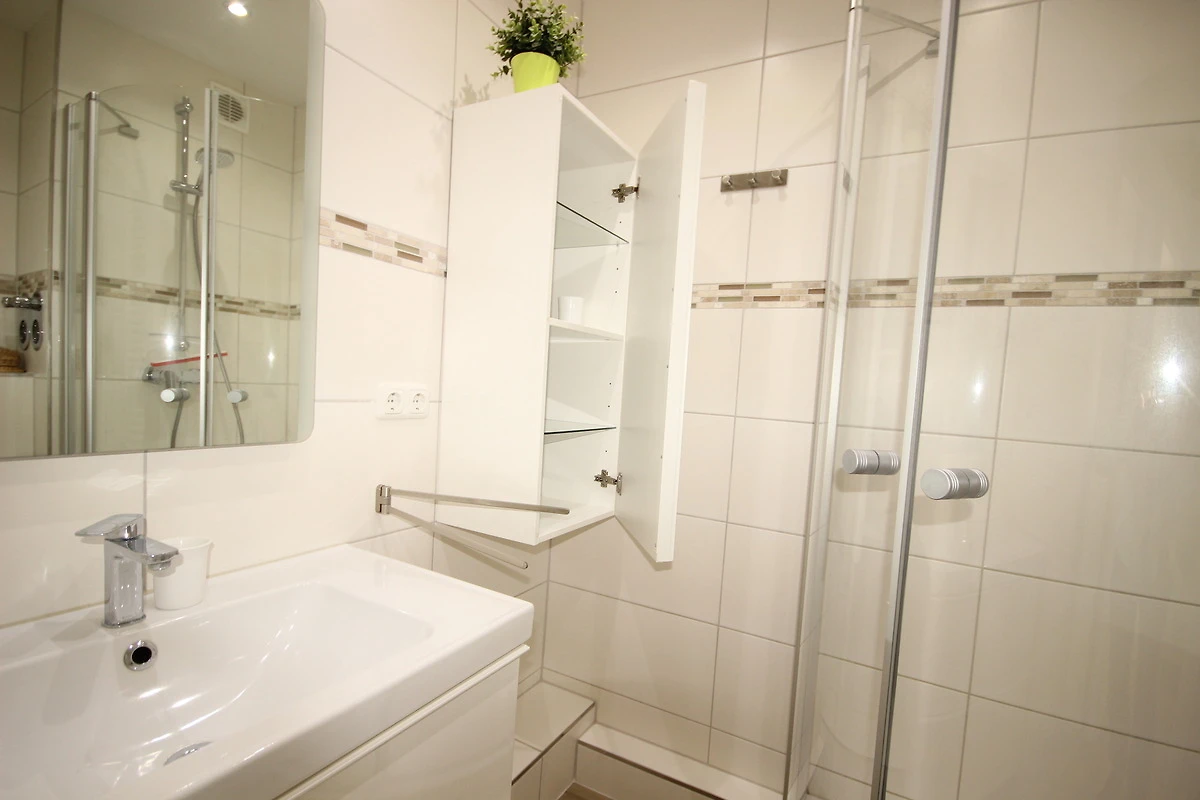Ein hell gefliestes, innen liegendes Bad mit Dusche/ Trennwand, WC und Waschbecken ist vorhanden.