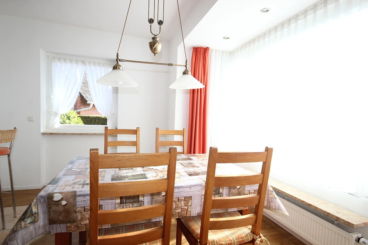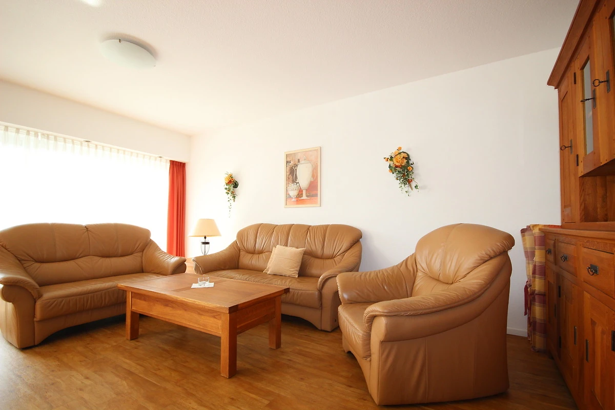 Im hellen Wohnbereich befindet sich eine gemütliche Ledergarnitur, Massivholzmöbel, Essplatz & TV. Hier ist der Zugang zur möblierten Süd-Terrasse.