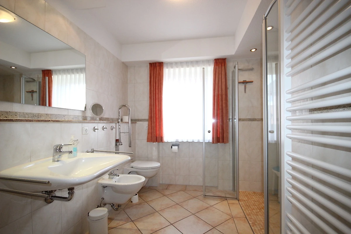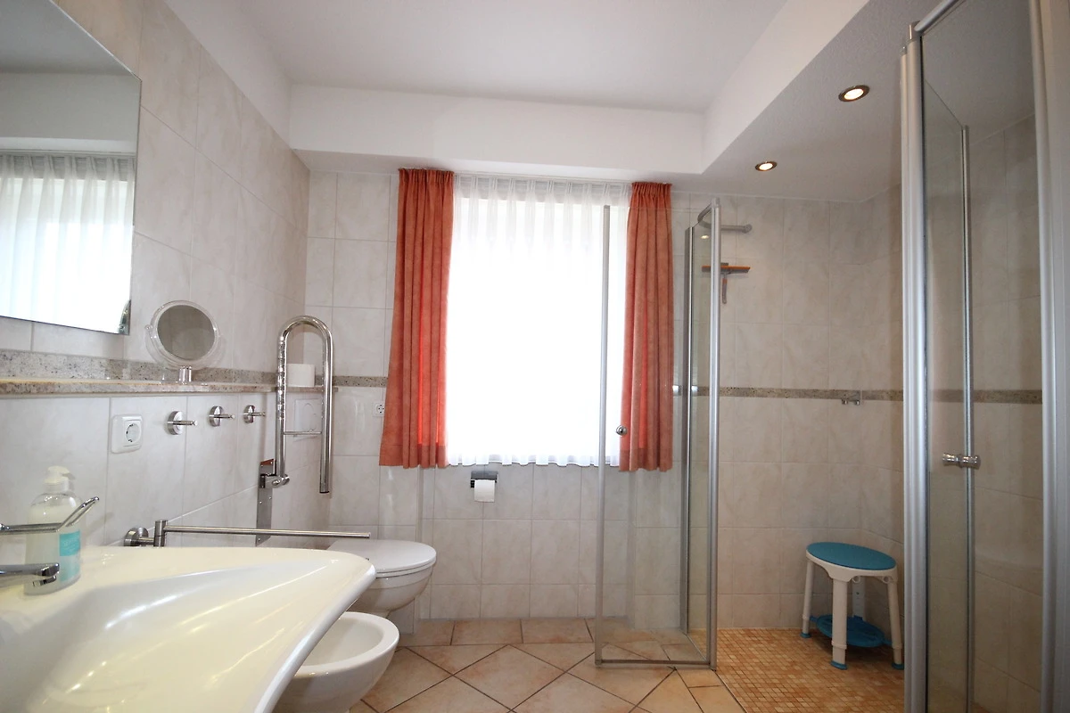 Ein barrierefreies Bad mit grosszügiger Dusche, WC, Waschtisch und Bidet.