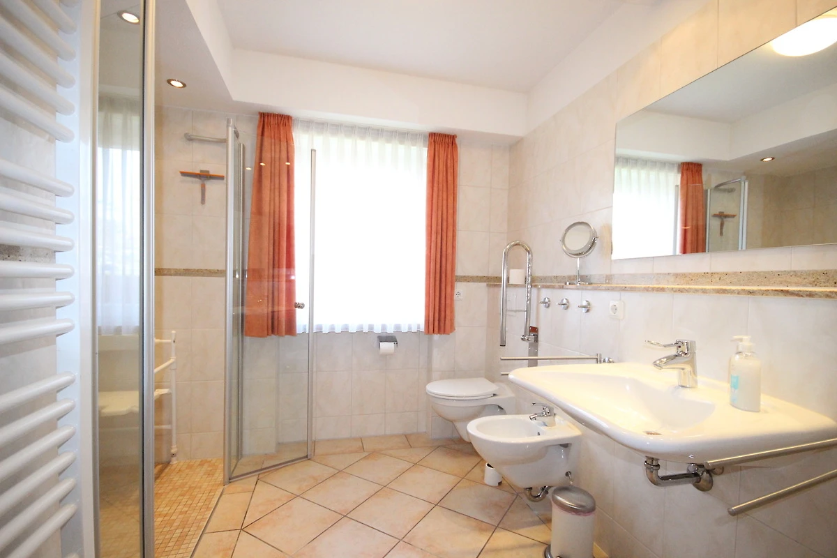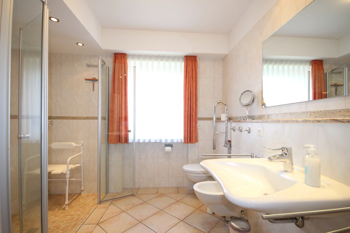 Ein barrierefreies Bad mit grosszügiger Dusche, WC, Waschtisch und Bidet.