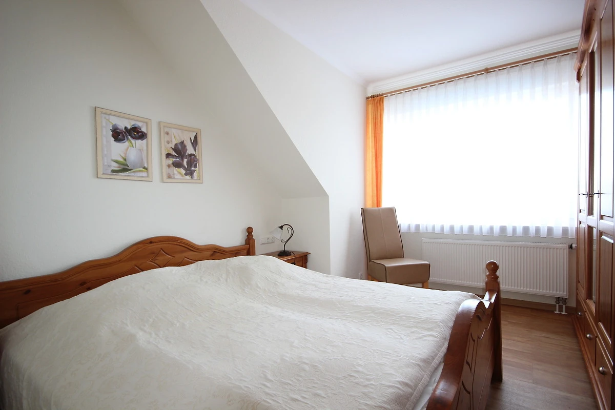 Im Schlafzimmer ist ein komfortables Doppelbett & Kleiderschrank vorhanden.