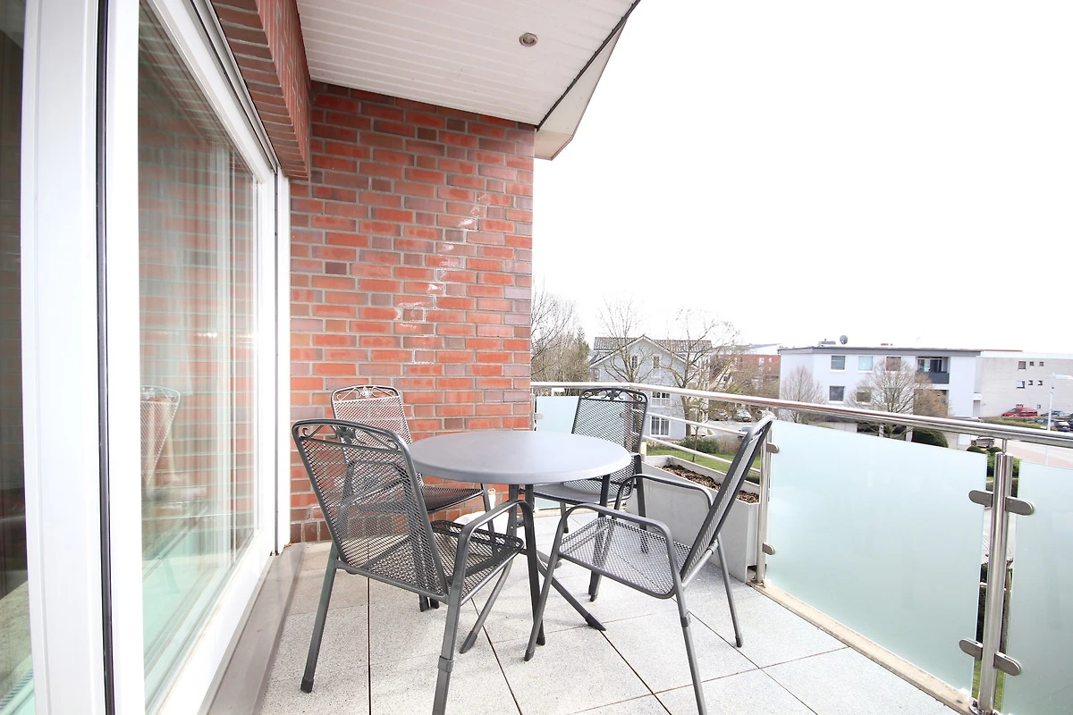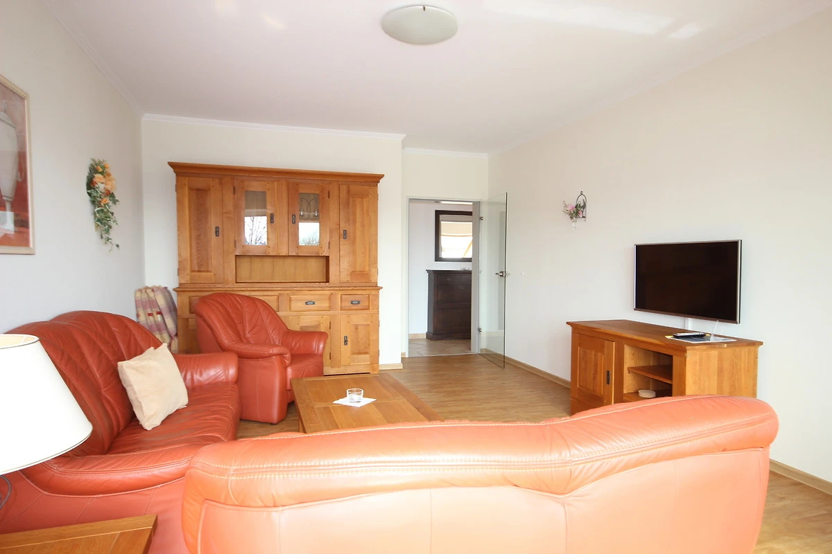 Im gemütlichen Wohnbereich finden Sie eine bequeme Ledergarnitur, Massivholzmöbel, Essplatz für 4 Personen & Fernseher sowie Zugang zum sonnigen, möblierten Süd-Balkon vor.