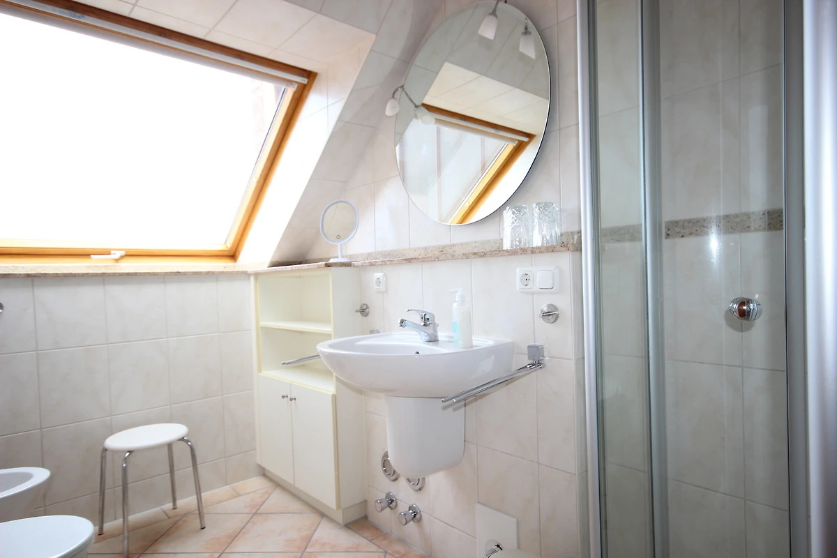 Helles Bad mit grosser Dusche, WC, Waschtisch & Bidet.