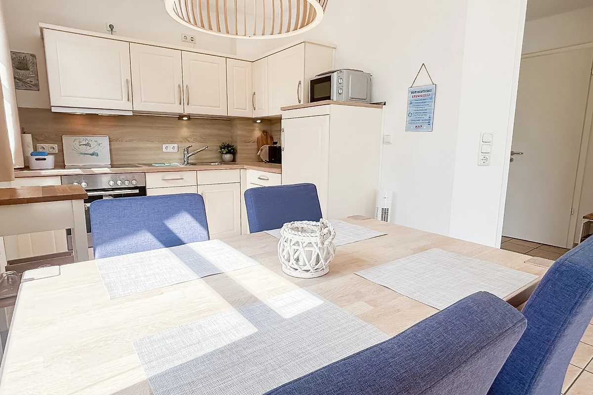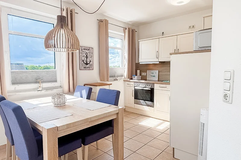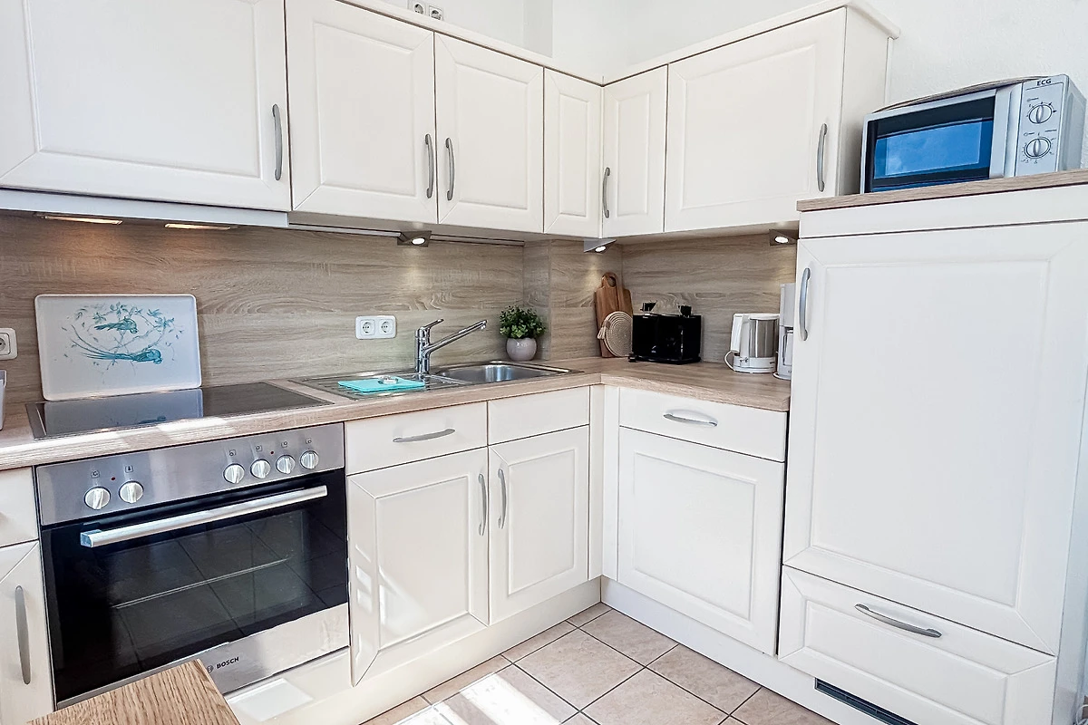 Die angrenzende, offene Küche mit Geschirrspüler, Backofen, Cerankochfeld, Kühlschrank mit Gefrierfach, Mikrowelle sowie allen üblichen Küchengeräten ist sehr gut ausgestattet.