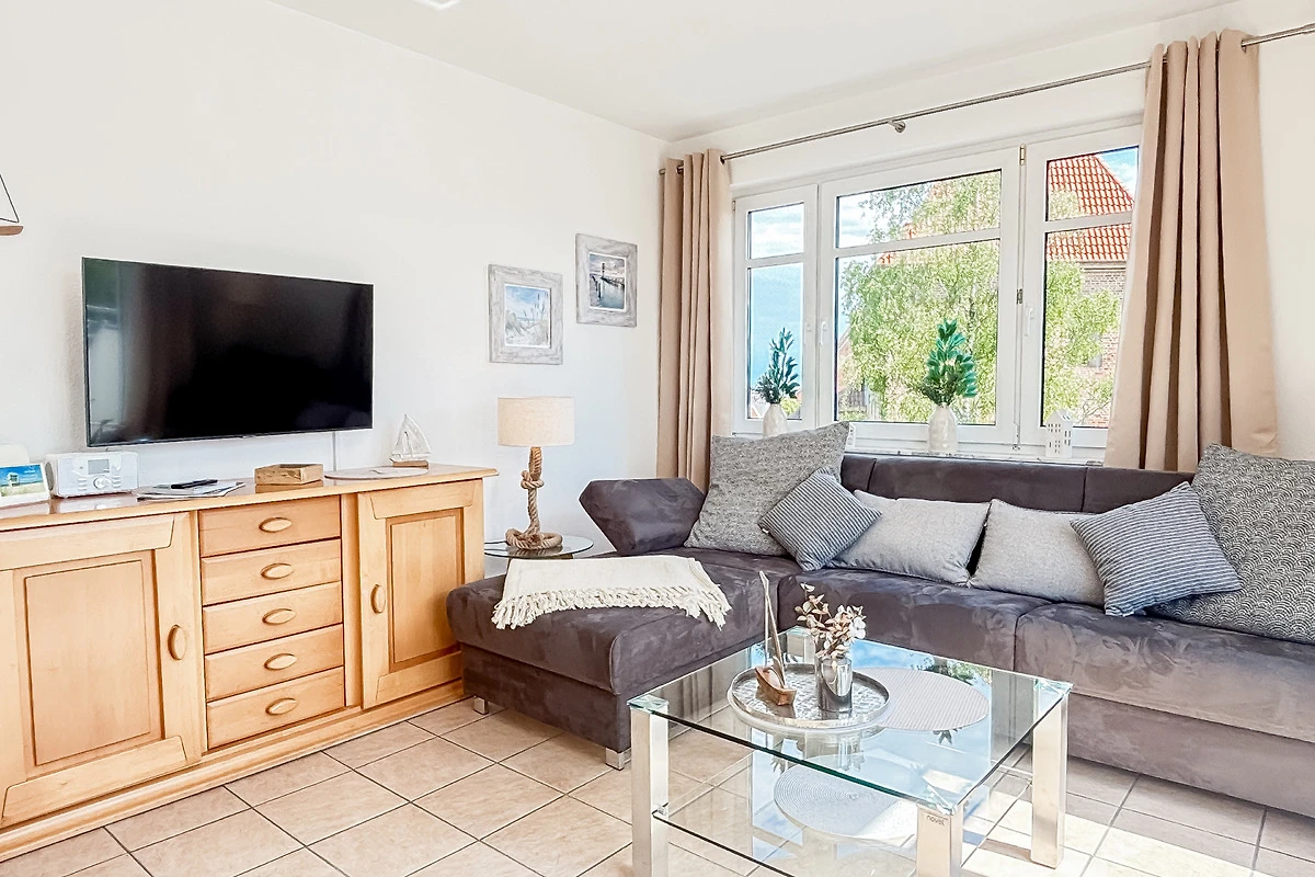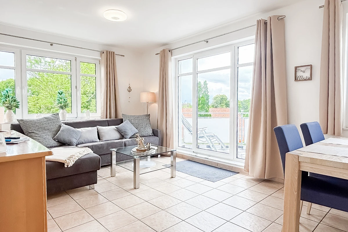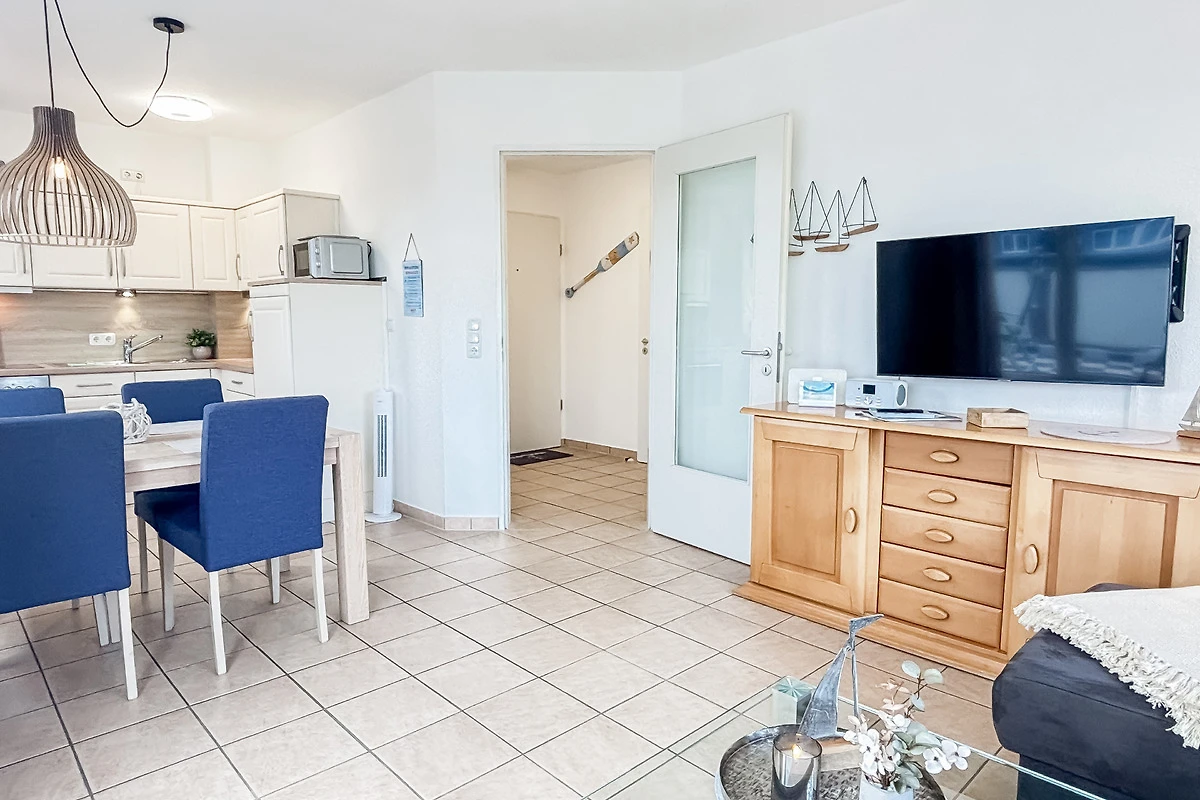 Der schön geschnittene Wohn-/Essraum ist mit bequemer Couchgarnitur, Sideboard und Essplatz für 4 Personen, TV, WLAN, Radio und DVD gemütlich eingerichtet. Das Sofa ist bequem für 2 Personen zum Bett ausziehbar. Zugang zum Süd-West-Balkon.