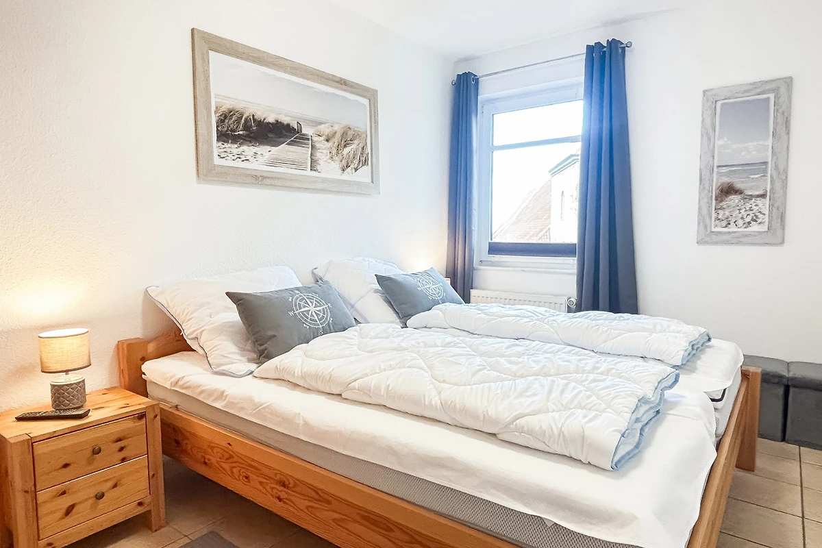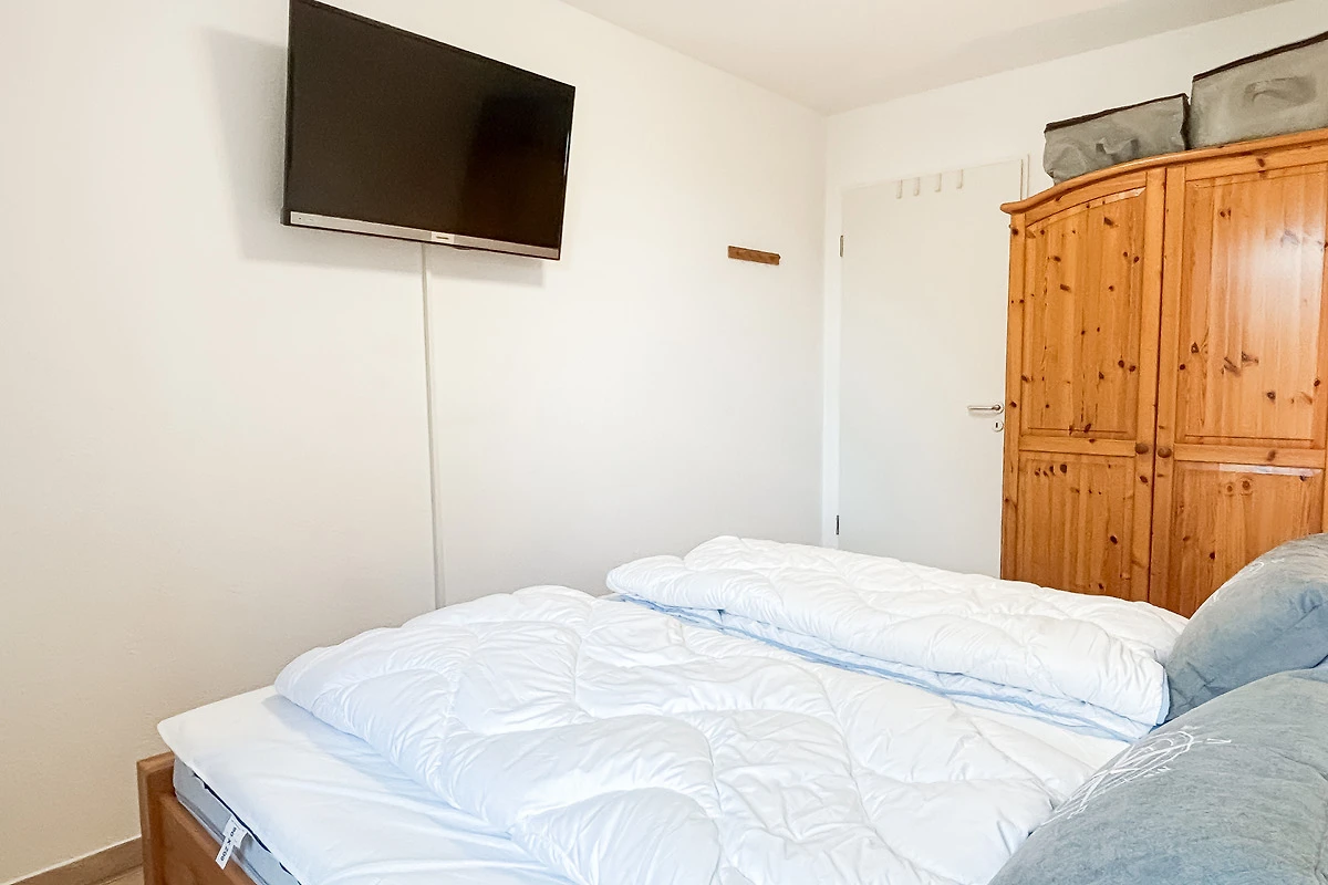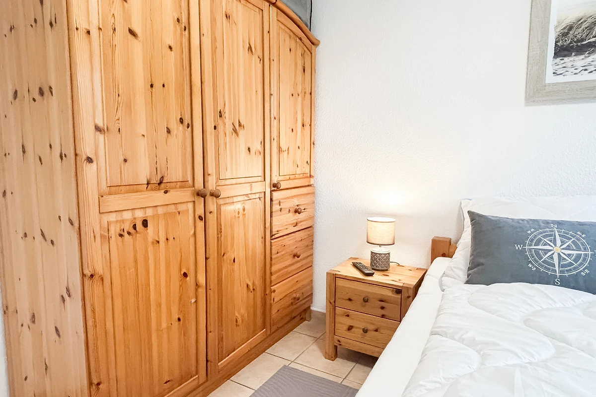 Das Schlafzimmer verfügt über ein bequemes Doppelbett und einen Kleiderschrank.