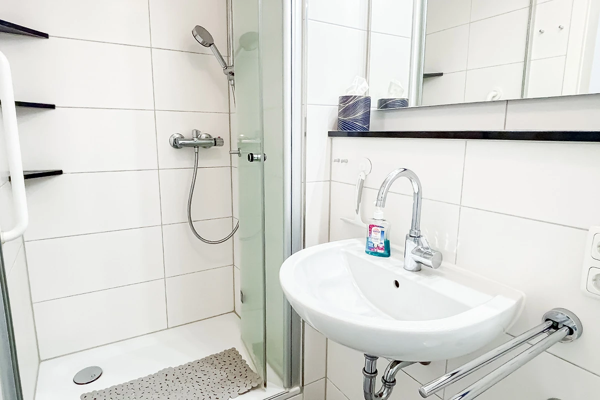 Das moderne, weisse Badezimmer hat eine geräumige Dusche, Waschbecken & WC.