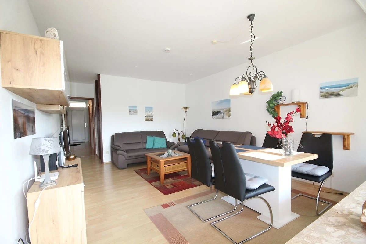 Das gemütliche Wohnzimmer verfügt über ein Schlafsofa für bis zu 2 Personen, einen schönen Essplatz, Flachbild-TV und einer Terrasse mit Süd-Ausrichtung im Hochparterre.