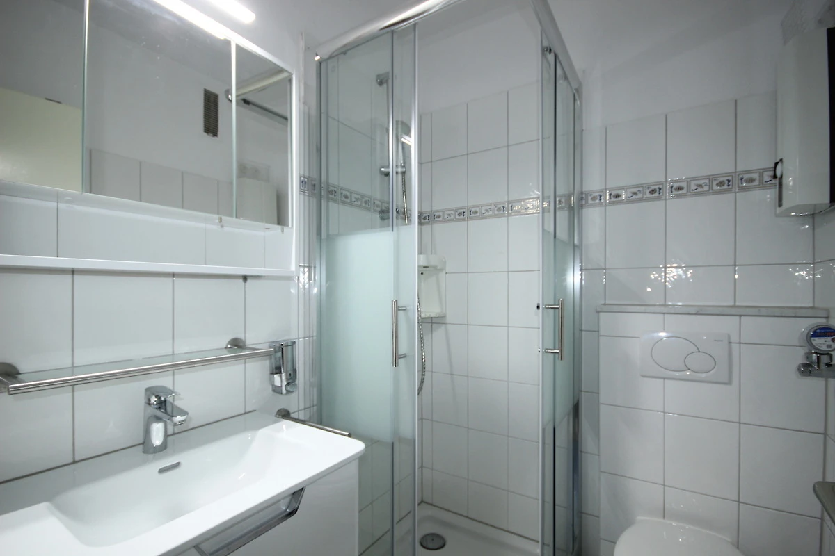 Ein helles, freundliches Bad mit Dusch-Kabine, WC und Waschbecken ist vorhanden.