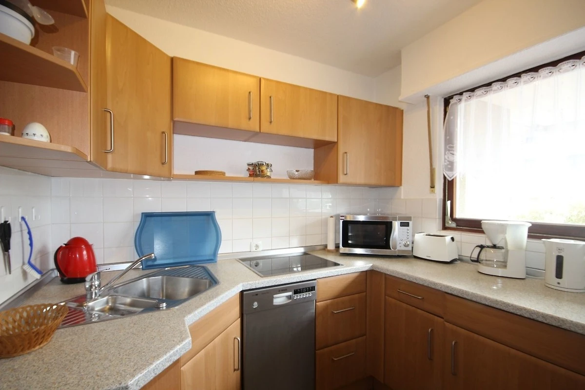 Die schöne, moderne Einbauküche ist mit Cerankochfeld, Mikrowelle, Kühlschrank-Gefrierfach, Geschirrspüler sowie den üblichen Küchengeräten sehr gut ausgestattet.