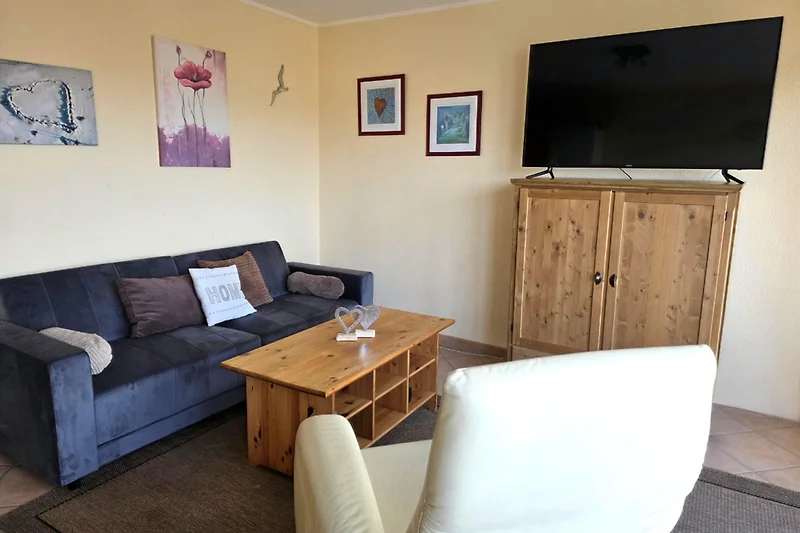 Wohnzimmer: Im hellen geräumigen Wohnbereich befindet sich ein Essplatz für 4 Personen und ein Ecksofa zum Ausziehen, TV, Disk-Kompakt-Anlage + MP3-Player sowie ein bequemer Fernsehsessel. Eine sonnige Loggia mit Markise gehört ebenfalls dazu.