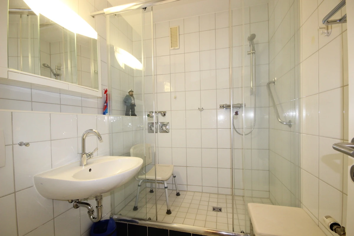 Behindertengerechtes Bad mit Dusche & Glastrennwand, WC, Waschbecken & Sitzmöglichkeiten.