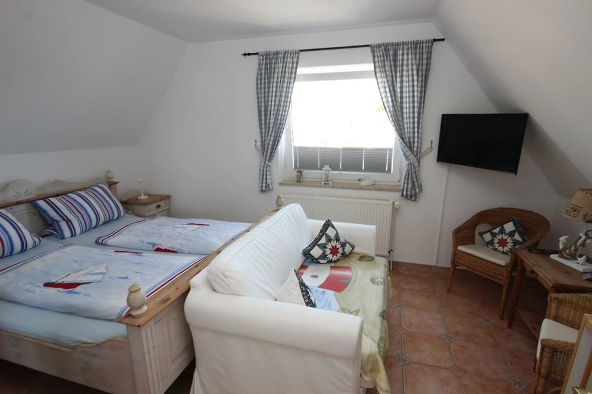 OG: Im 1. Schlafzimmer ist ein Doppelbett, Couch & TV-Gerät vorhanden.