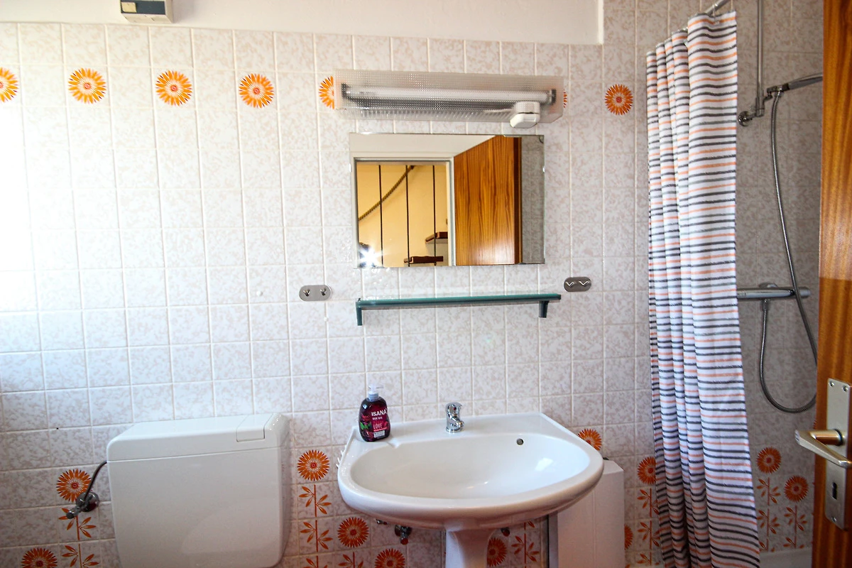 Helles Tageslicht-Bad mit Dusche, WC und Waschbecken im Erdgeschoss.