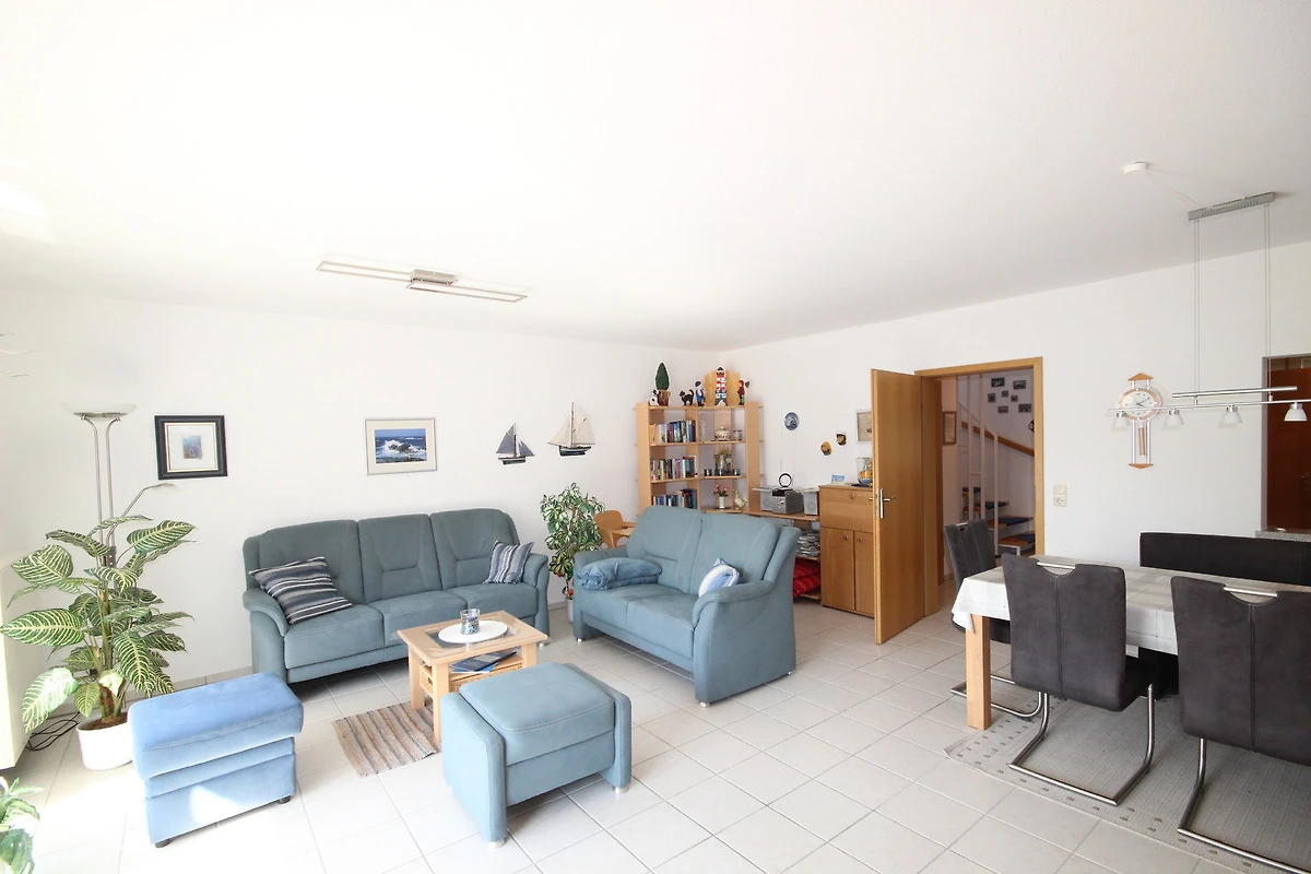 Grosszügiger Wohnbereich mit gemütlicher Sitzecke, Essplatz für 6 Pers., TV & Zugang zur Terrasse.